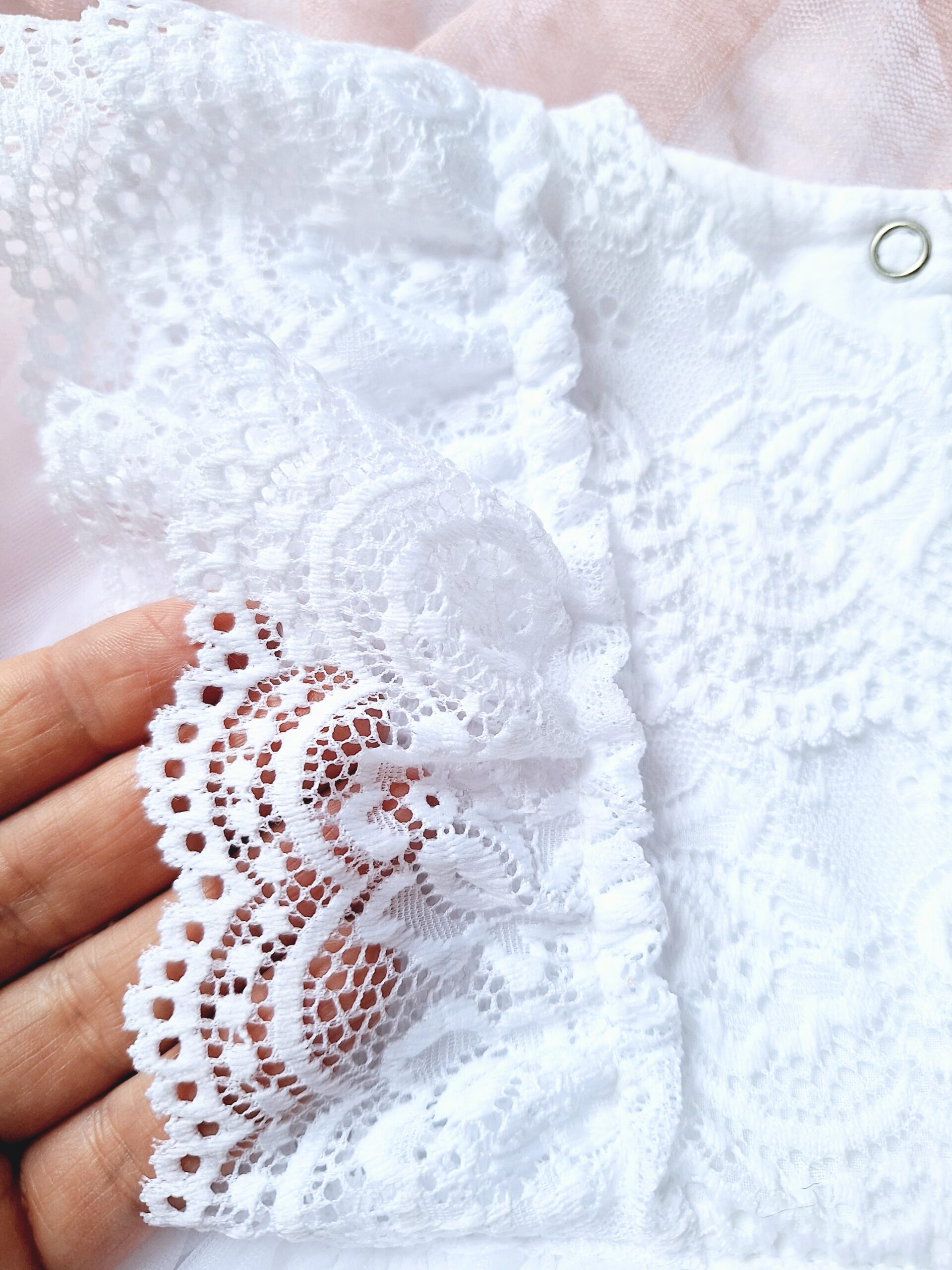 Cała sukienka jest uszyta na bawełnianej bazie, a jedyny poliester jaki został użyty w tej sukience to mięciutka koronka oraz tiul.