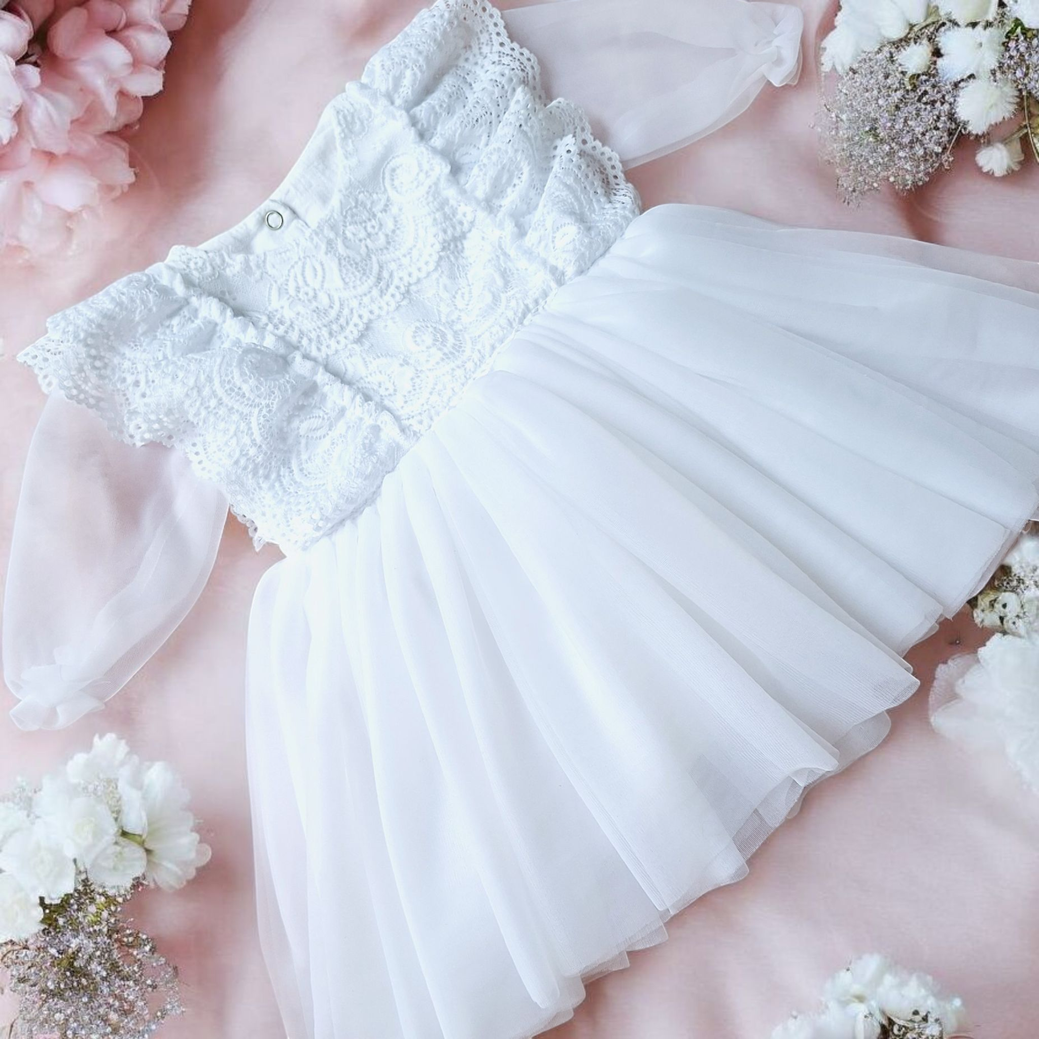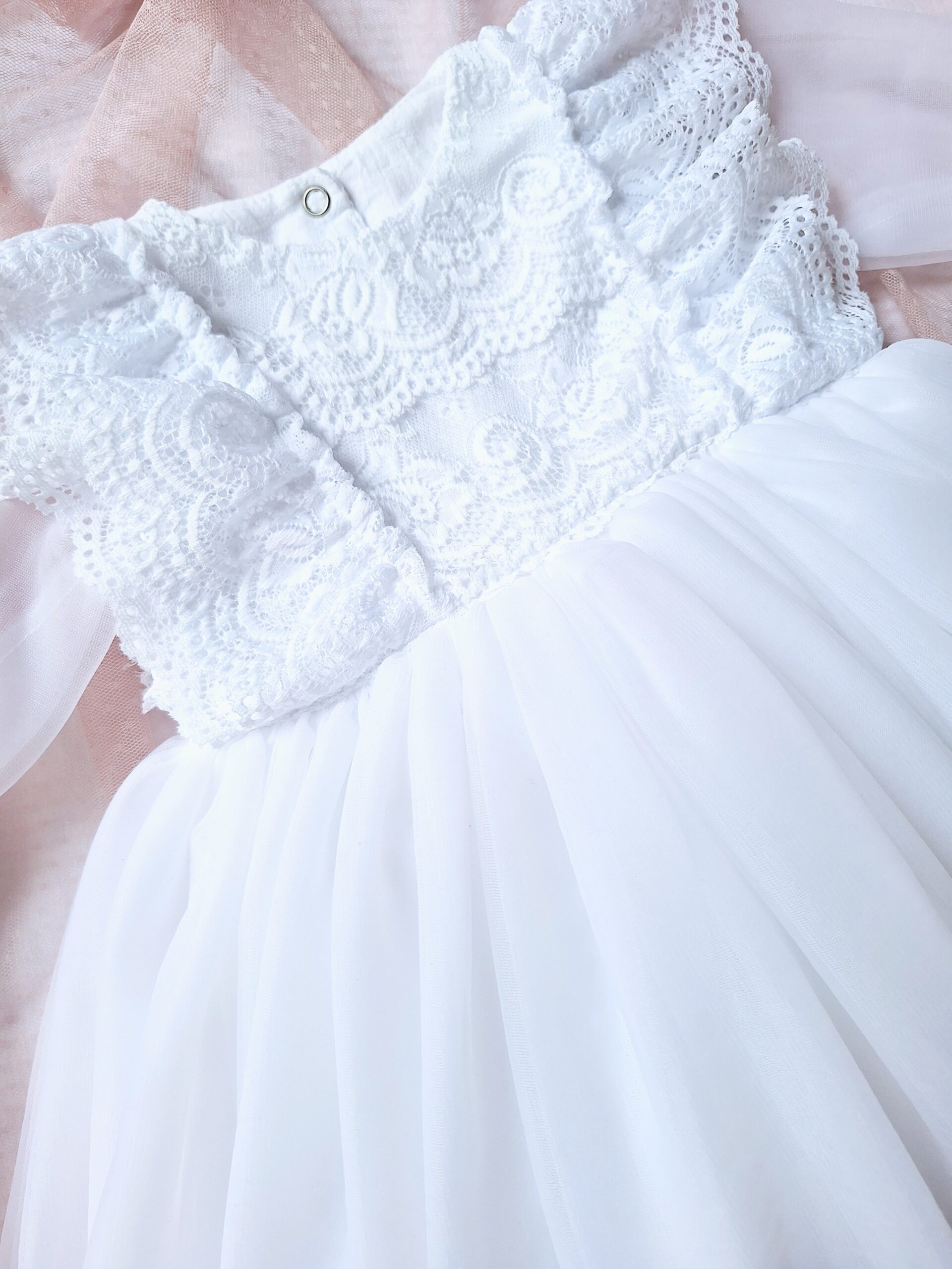 Sukienka do chrztu ma tiulowe rękawki wykończone gumeczką na nadgarstach.