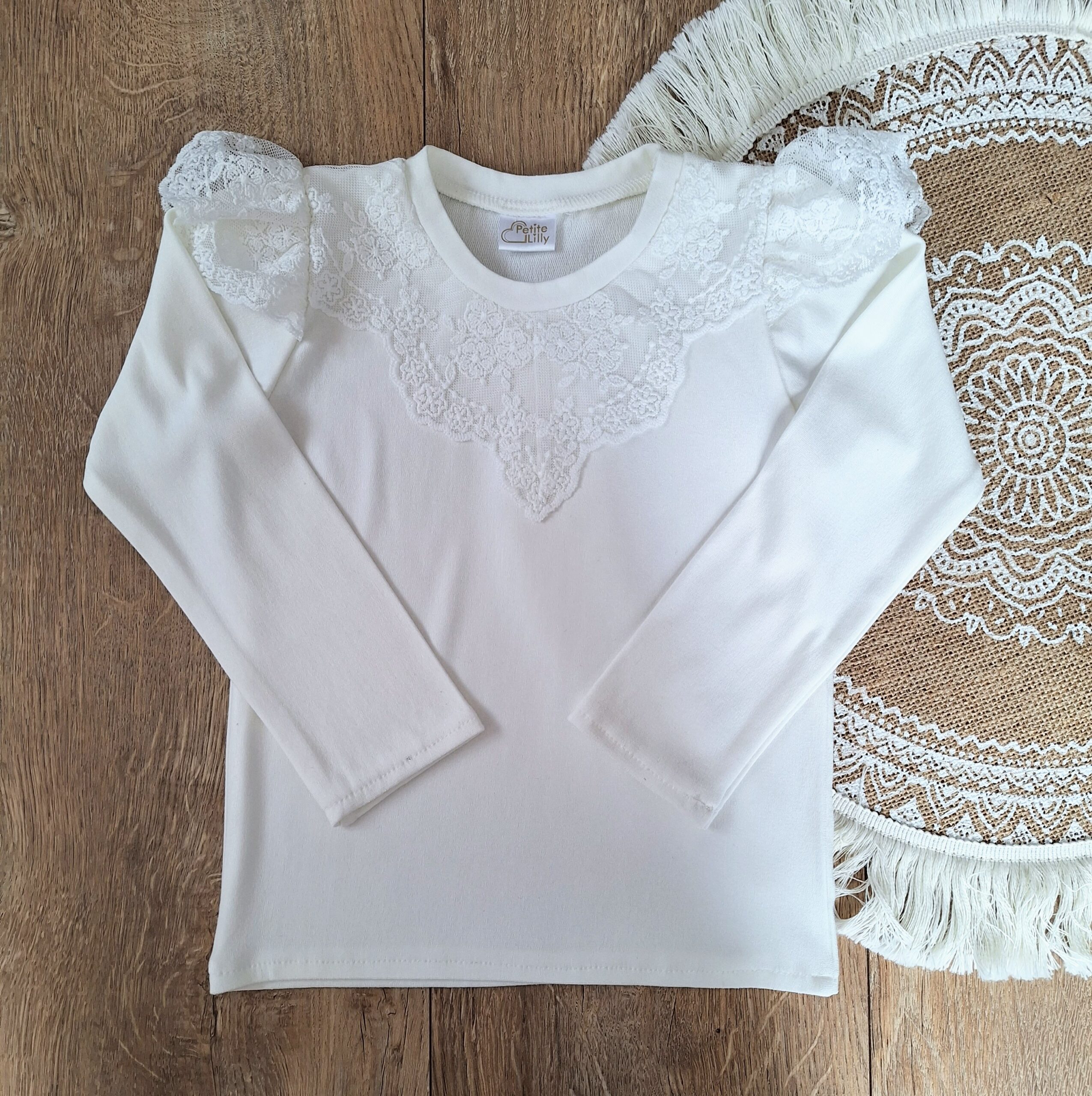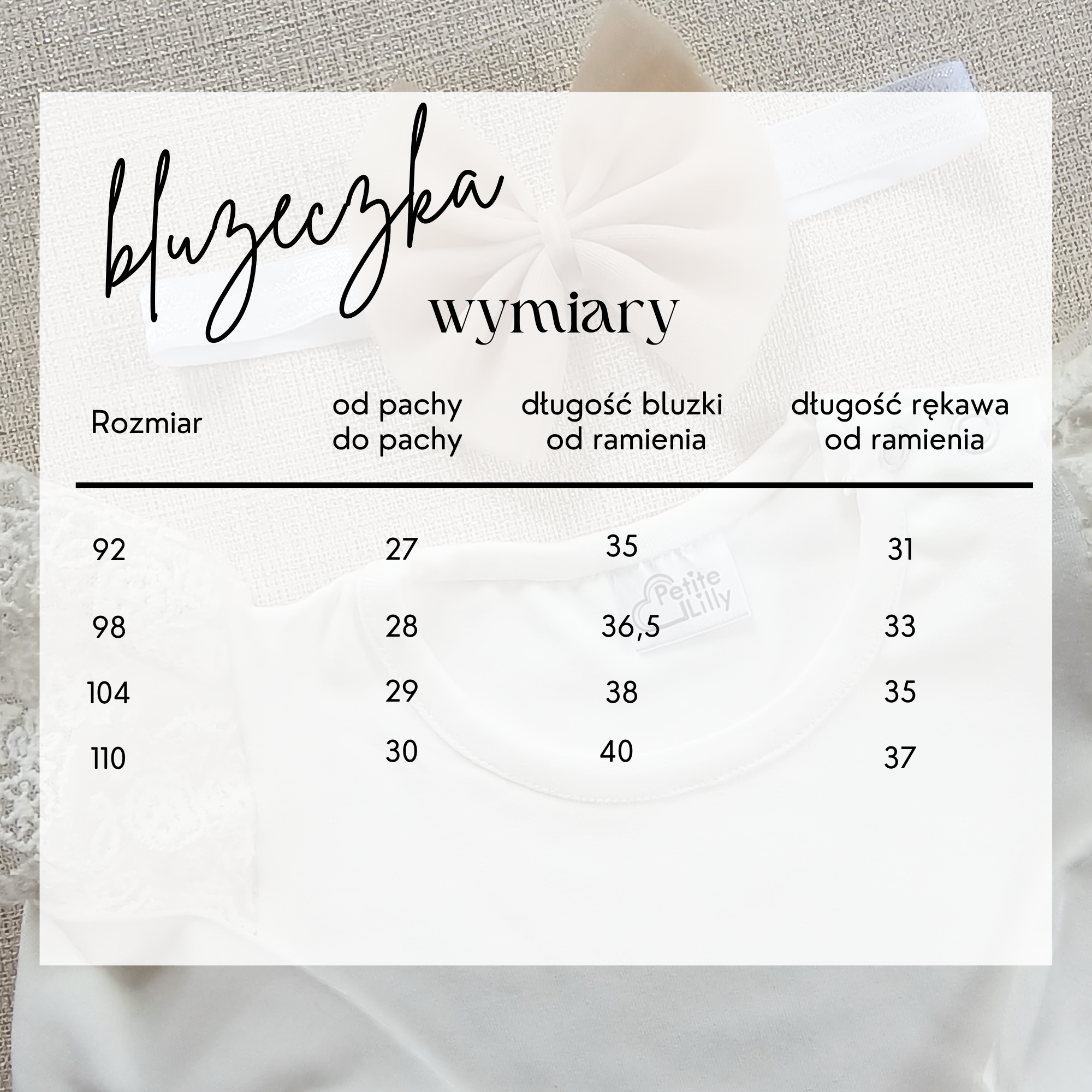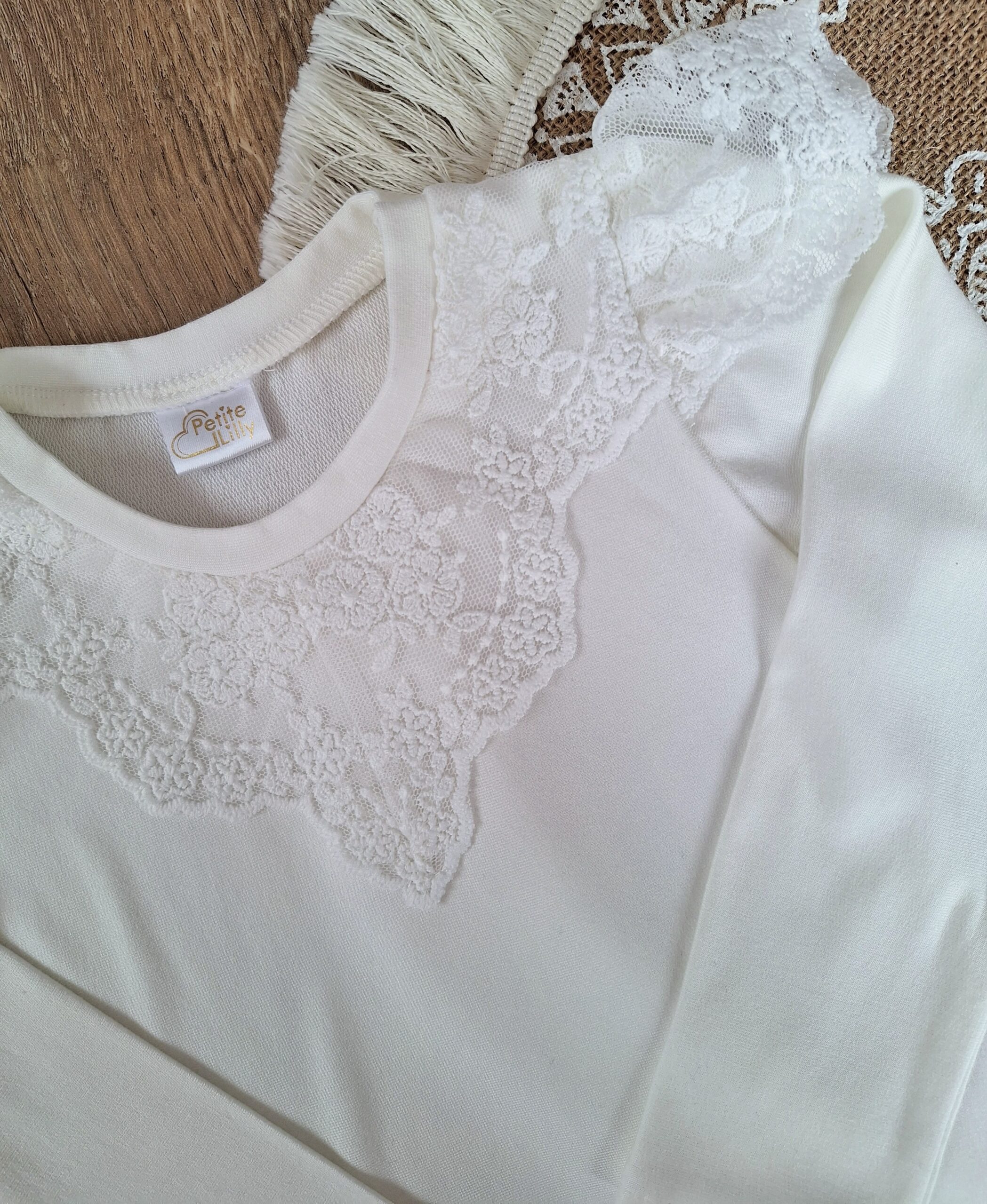 Ecru bluzeczka z długim rękawem wykonana z miękkiej i przyjemnej w dotyku dzianiny bambusowej, ozdobiona koronkowymi motylkami oraz piękna aplikacją z przodu.