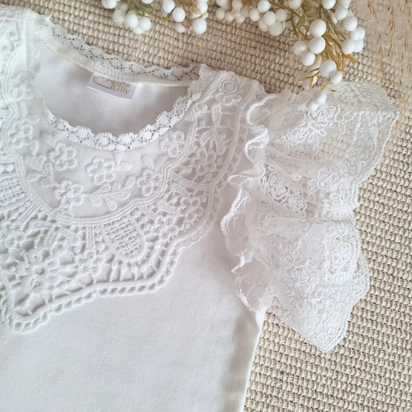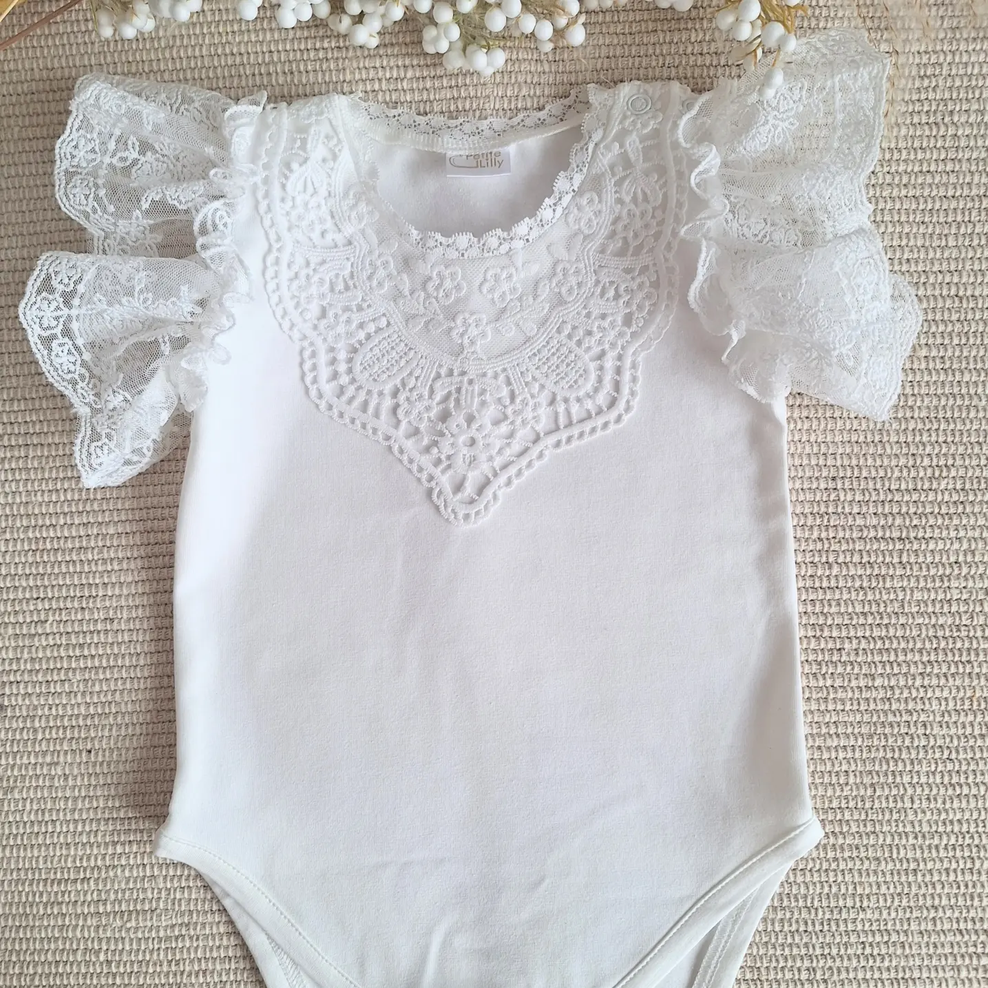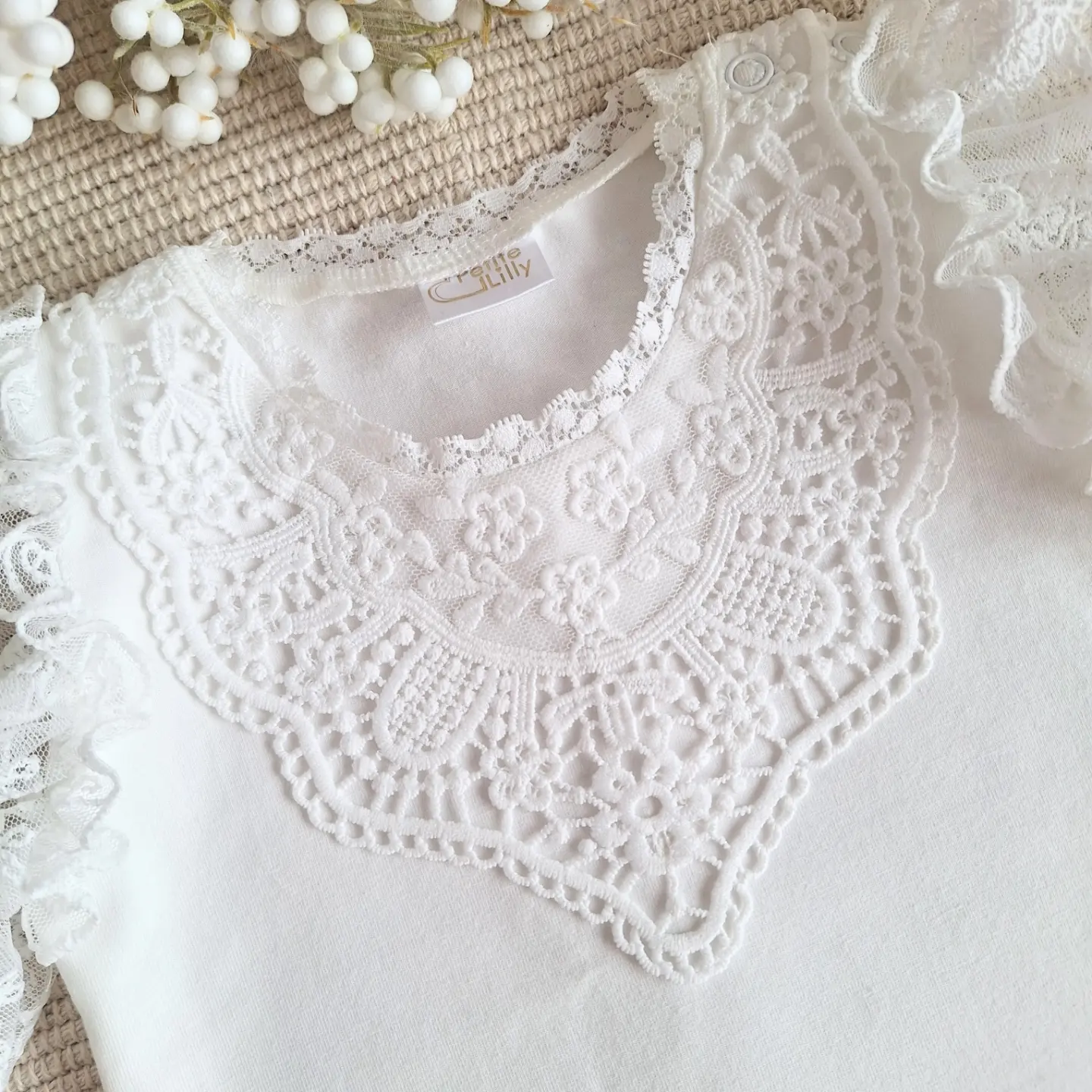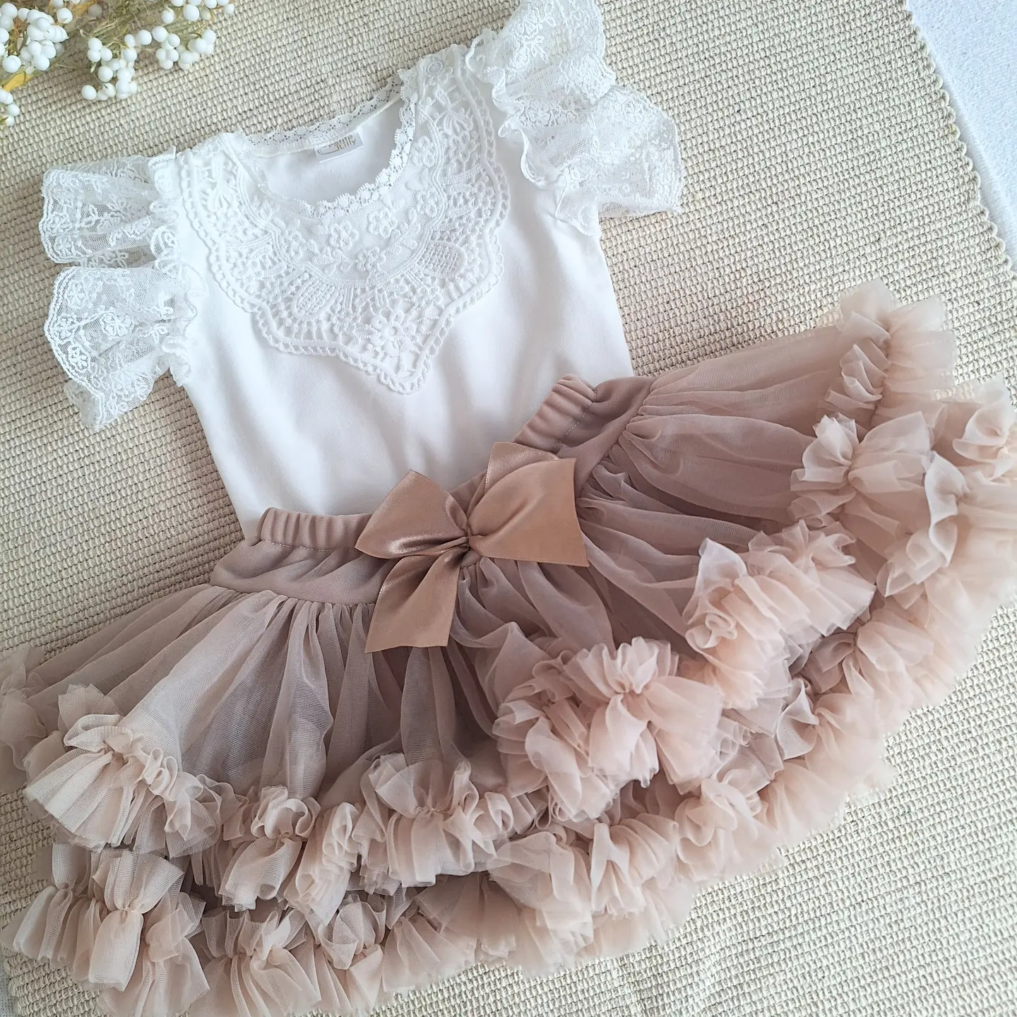 Przedmiotem sprzedaży jest komplet dla dziewczynki składający się z body w kolorze ecru lub bluzeczki ( PATRZ OPIS PONIŻEJ), spódniczki tiulowej oraz opaski z tiulową kokardką do kompletu.