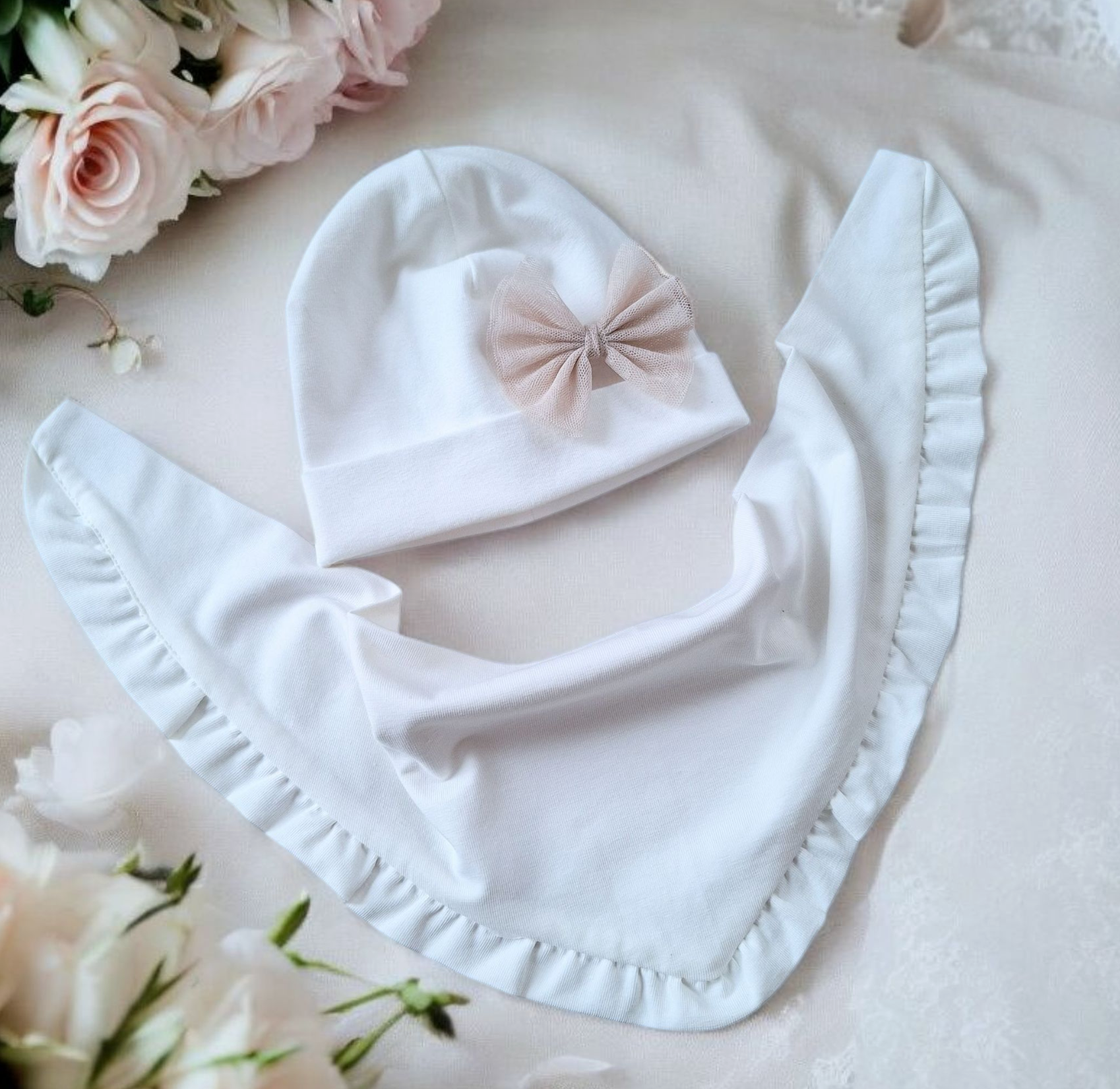 Komplet do chrztu uszyty jest z miękkiej, rozciągliwej i podwójnie złożonej dzianiny .