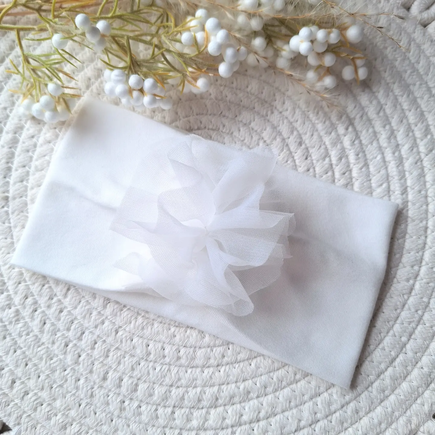 Opaska dla dziewczynki na chrzest kolorze ecru. Wykonana z miękkiej bawełnianej dzianiny ozdobiona delikatnym marszczeniem z przodu i tiulem. Idealna do jesiennych stylizacji.