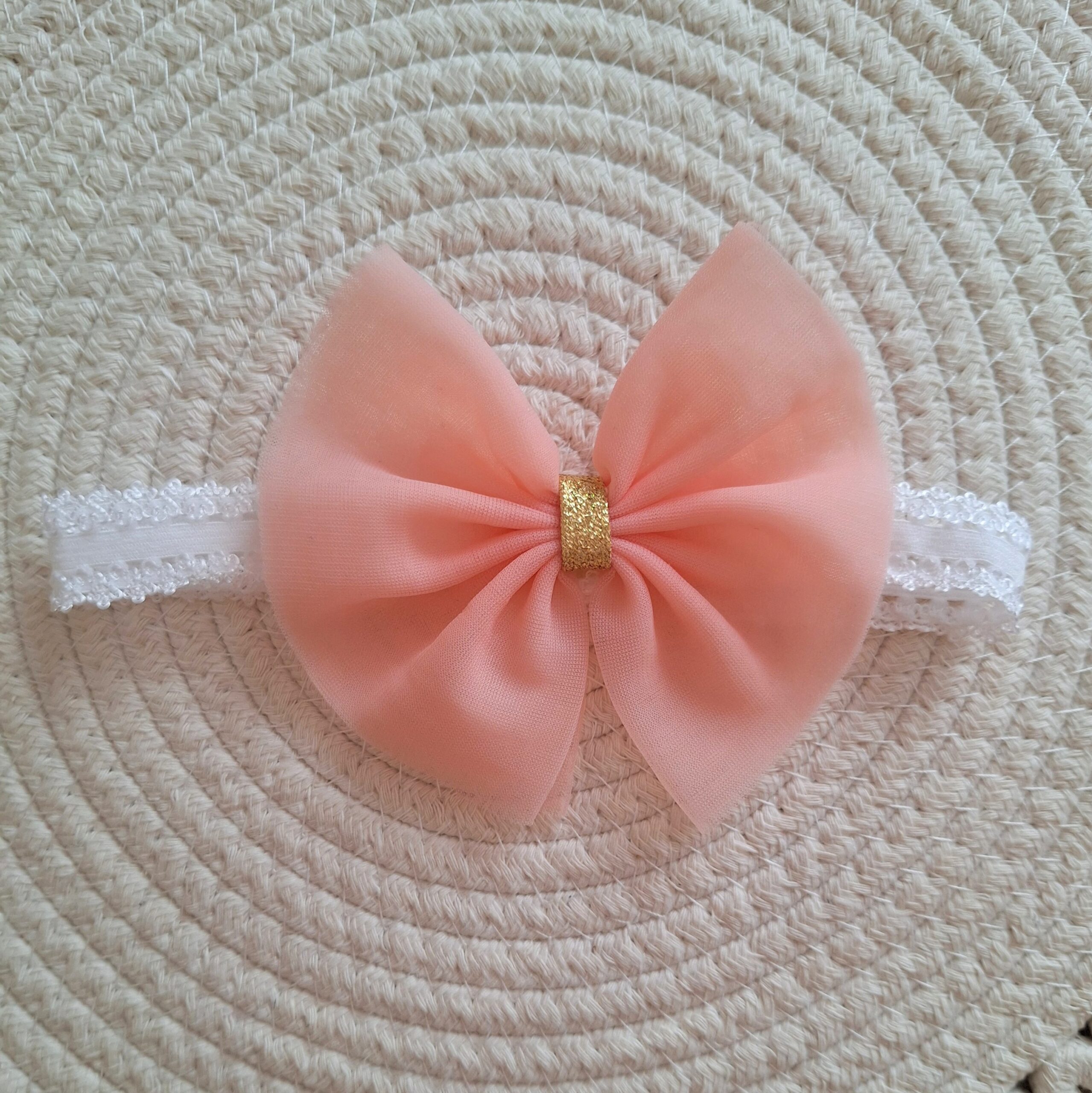 Opaska z tiulową kokardką i złotym środkiem w kolorze brzoskwiniowym wykonana na delikatnej koronkowej gumeczce w uniwersalnym rozmiarze.