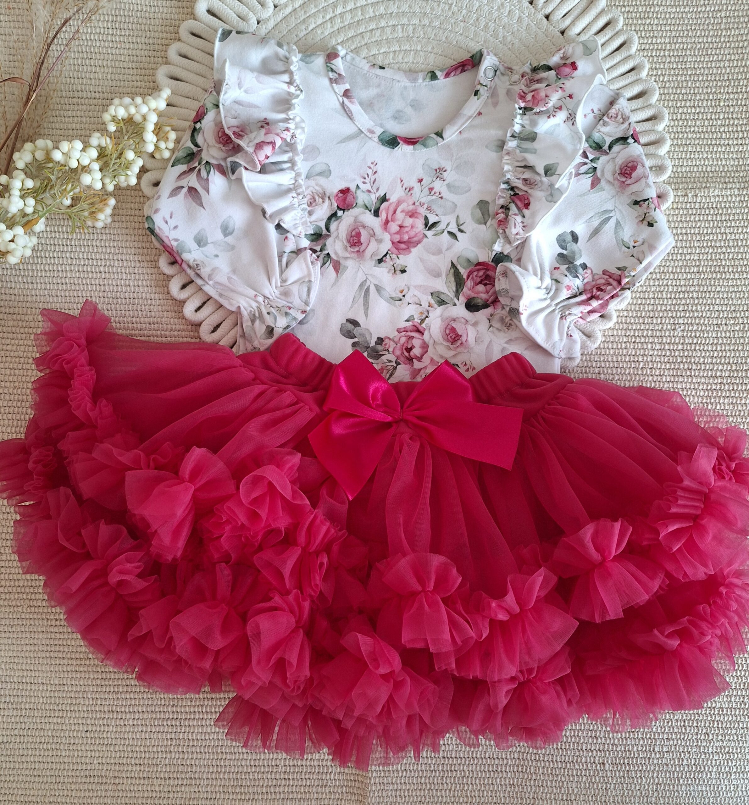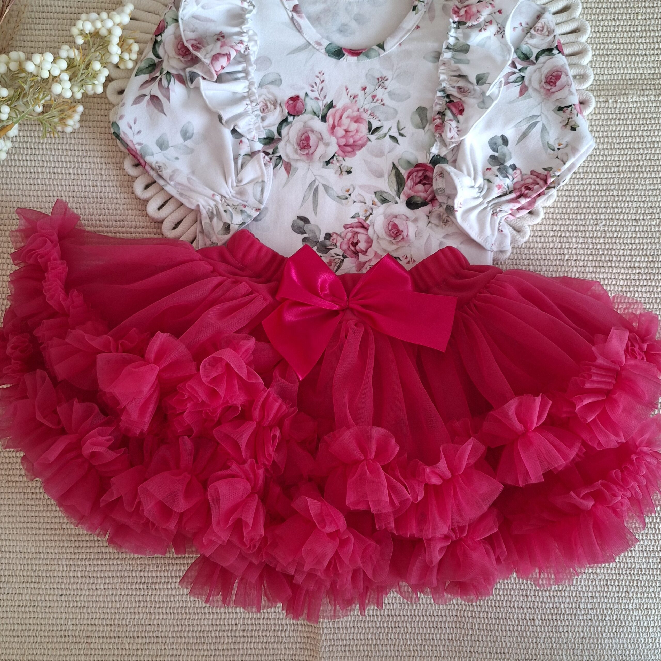 Urocza spódniczka z mnóstwem falbanek w pięknym, głębokim odcieniu. Spódniczka dla dziewczynki tutu to pozycja, która powinna znaleźć się w szafie każdej małej modnisi. Spódniczka tiulowa jest na gumeczce, ozdobiona satynową kokardką z przodu.