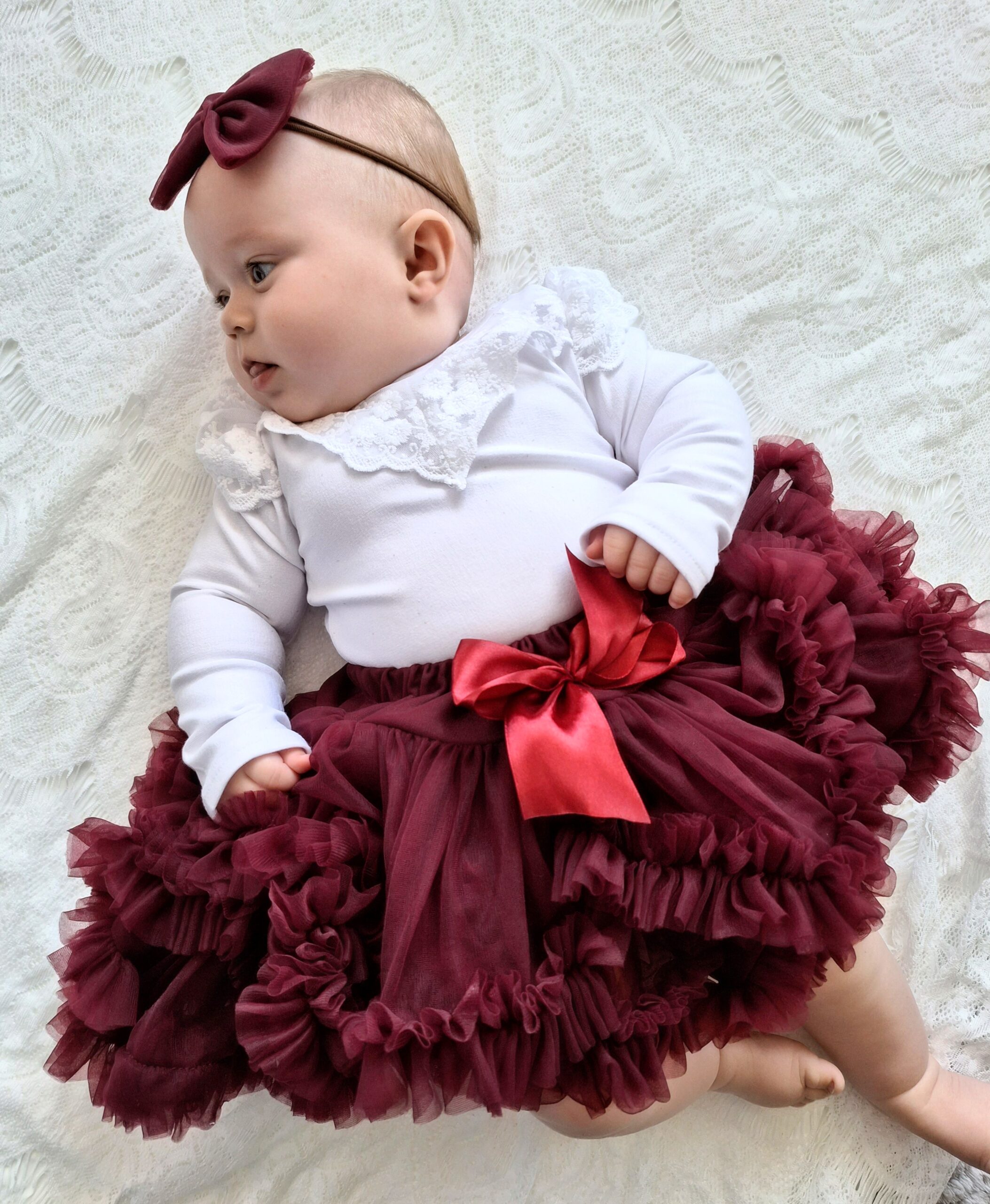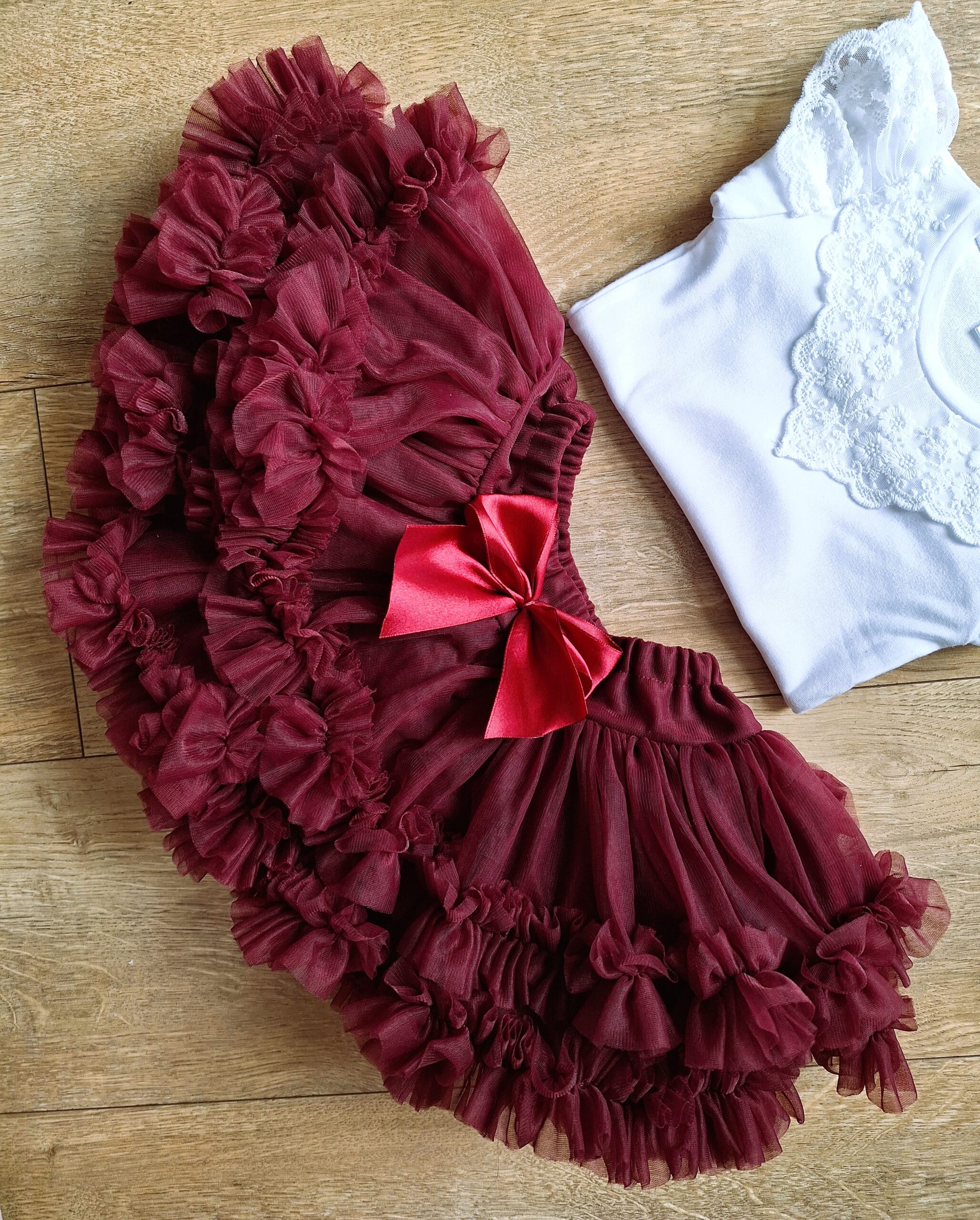 Tiulowa spódniczka dla dziewczynki w typowo świątecznym rubinowym kolorze. Duża ilość tiulu i falbanek sprawia, że spódniczka pięknie faluje i zachwyca swoją lekkością i puszystością.