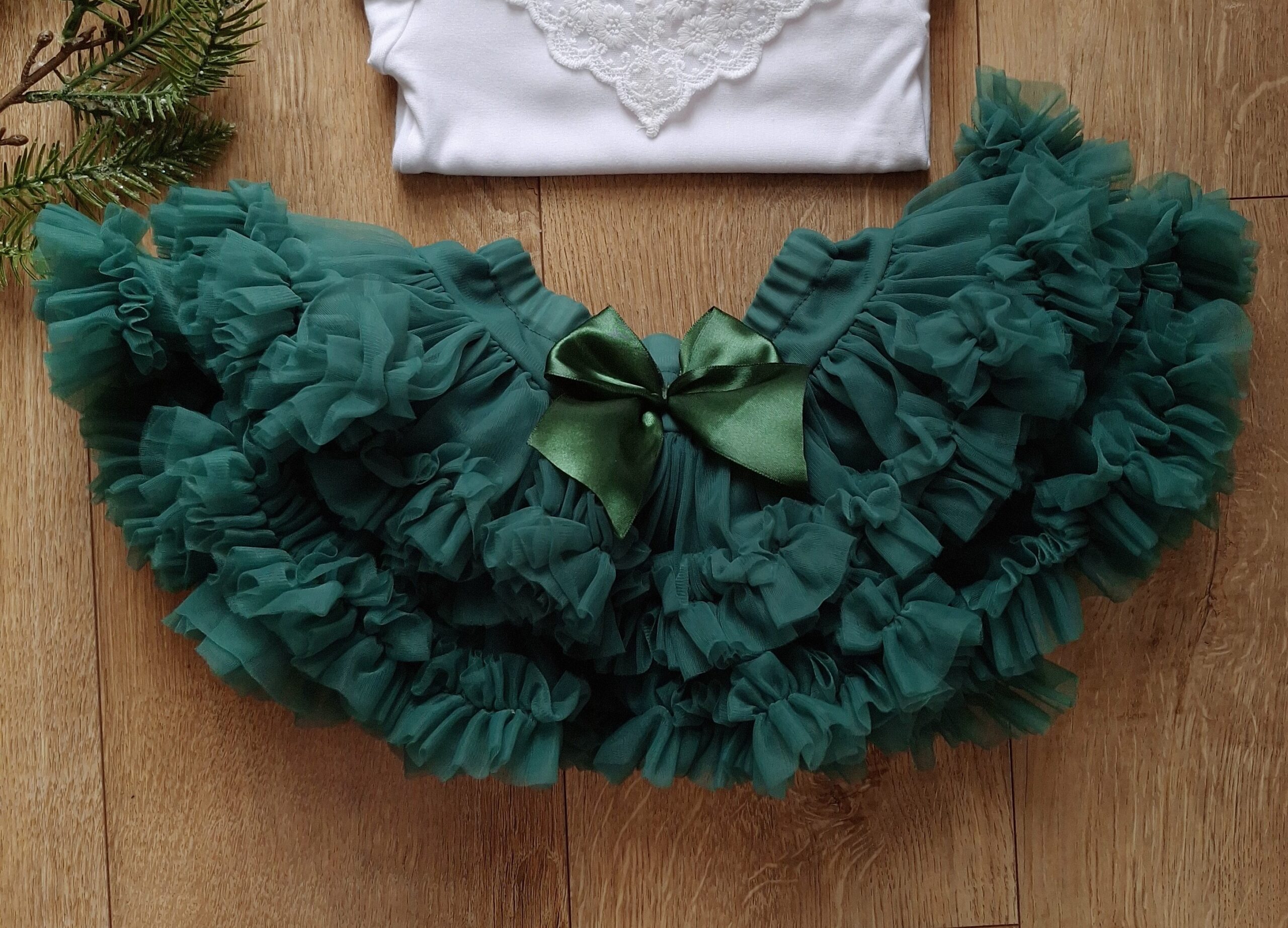 Tiulowa spódniczka dla dziewczynki w szmaragdowym kolorze.