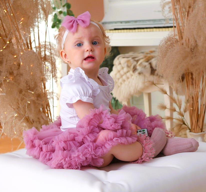 Puszysta, elegancka tiulowa spódniczka dla dziewczynki w kolorze wrzosowego różu. Spódniczka została uszyta z dwóch warstw mocno zmarszczonego tiulu. Odpowiednio skrojone i naszyte dołem marszczenie nadało objetości . Spódniczka będzie idealnym rozwiązaniem dla Mam , które szukają dla swoich Córeczek kreacji na roczek czy urodziny.