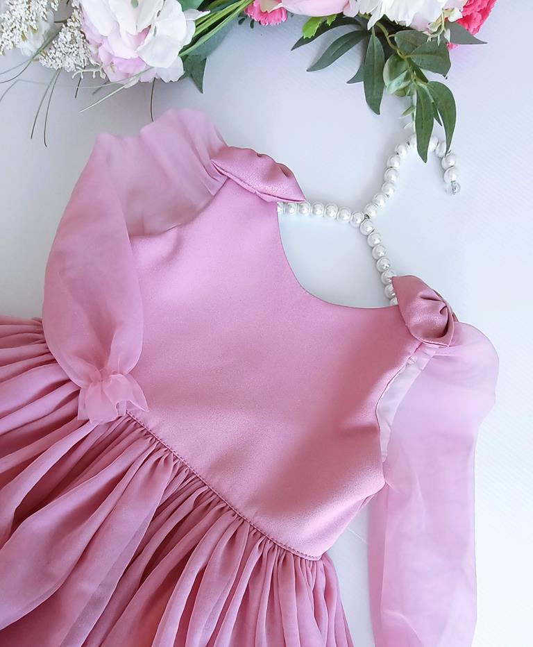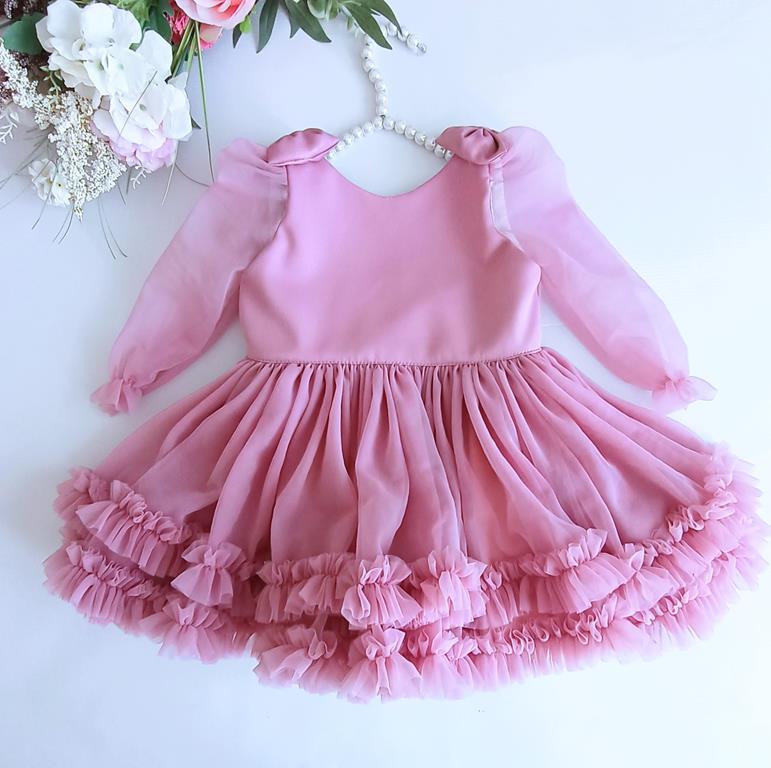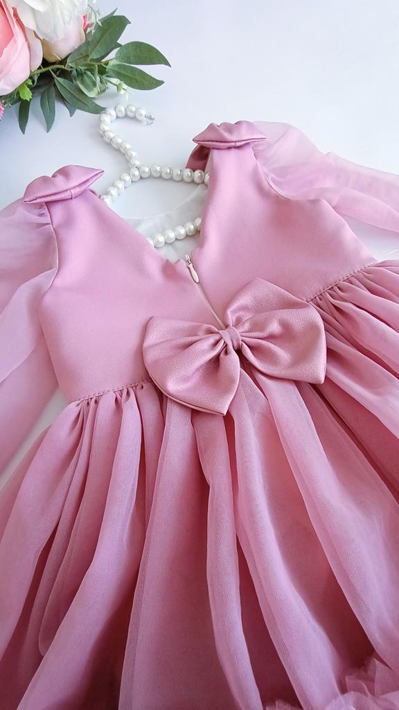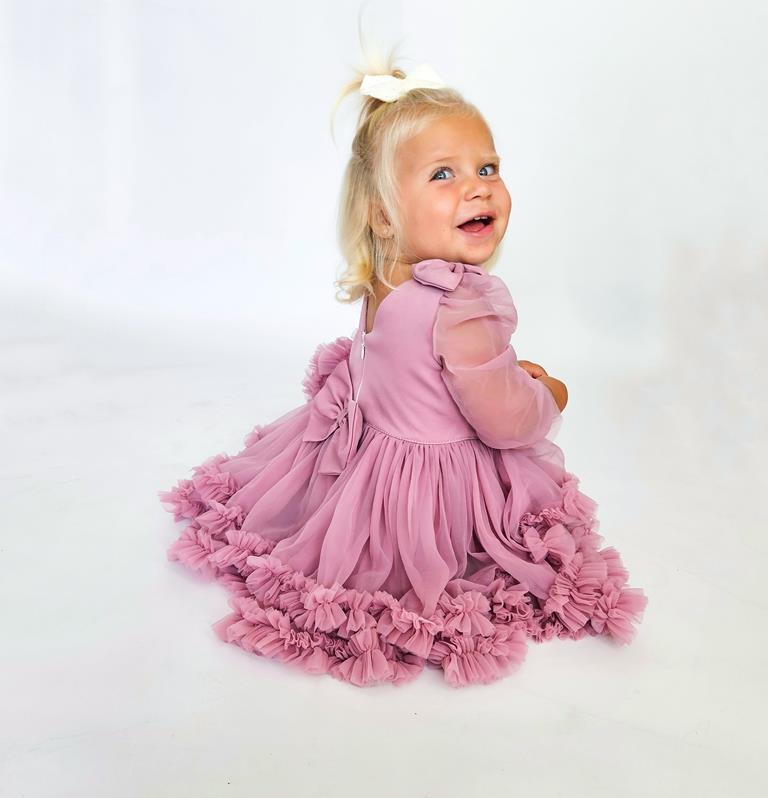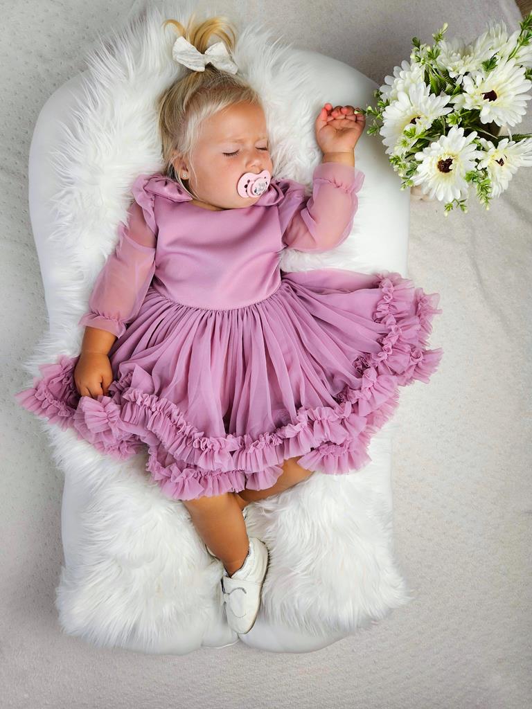 Wyjątkowa sukienka dla małych księżniczek na roczek, wesele czy urodziny! Jest wykonana z najwyższej jakości tiulu, który jest lejący i nie zaczepia się. Długi rękawek z delikatnym marszczeniem przy ramieniu i uroczymi kokardkami na ramionach, dodaje sukience wyjątkowego uroku.