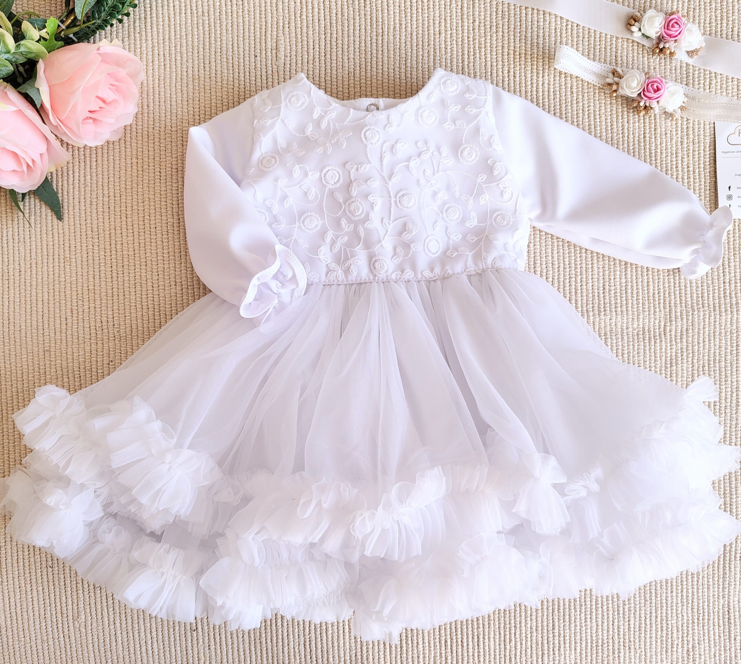 Dół sukienki to dwie tiulowe falbany, a naszyte marszczenia sprawiają, że sukienka na chrzest wygląda niezwykle bogato i puszysto, jednocześnie zachowując lekkość i wygodę noszenia.