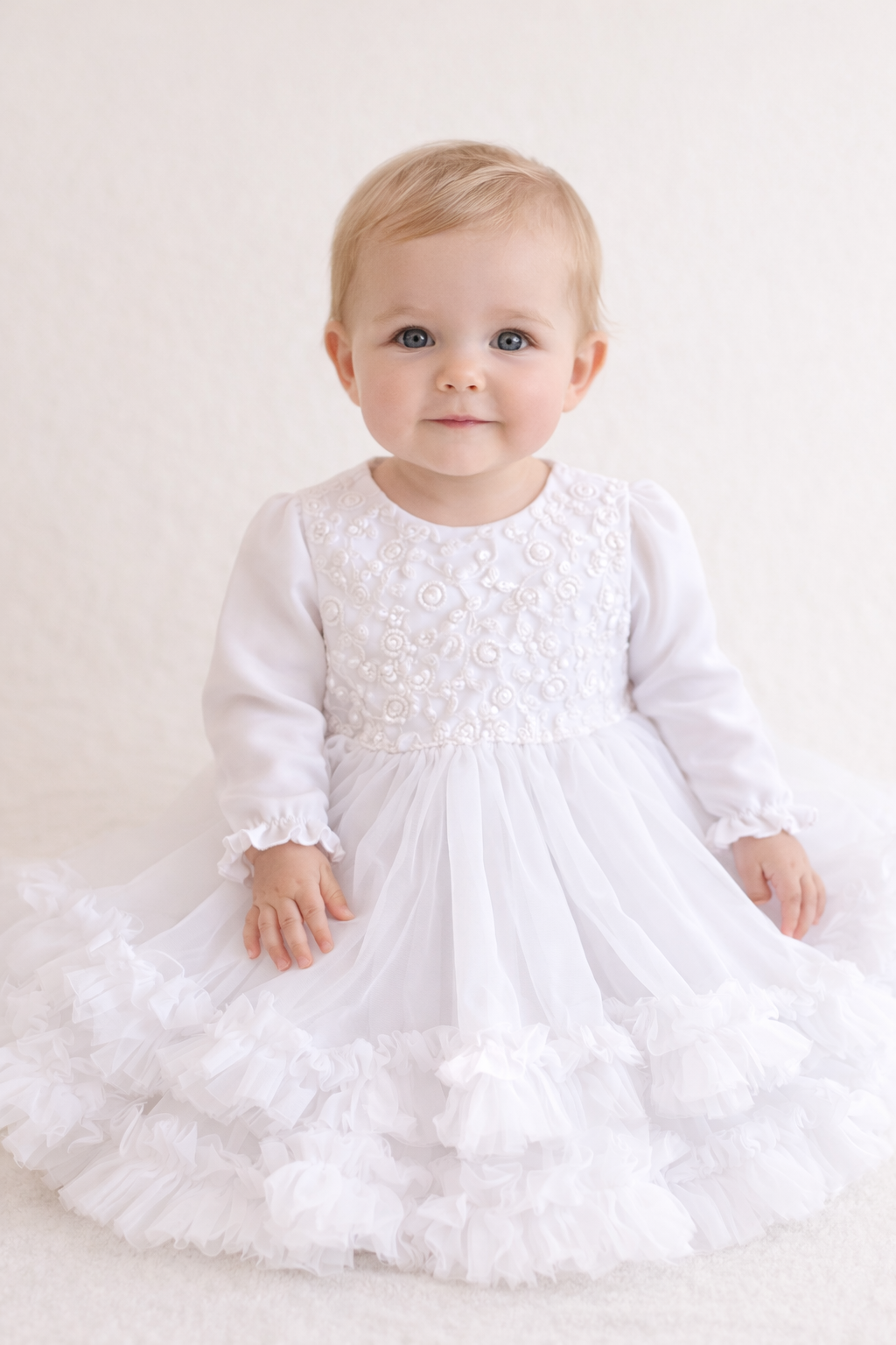 Ta wyjątkowa, tiulowa sukienka na Chrzest dla dziewczynki Sofia wyróżnia się stylowym designem i śnieżnobiałym kolorem.