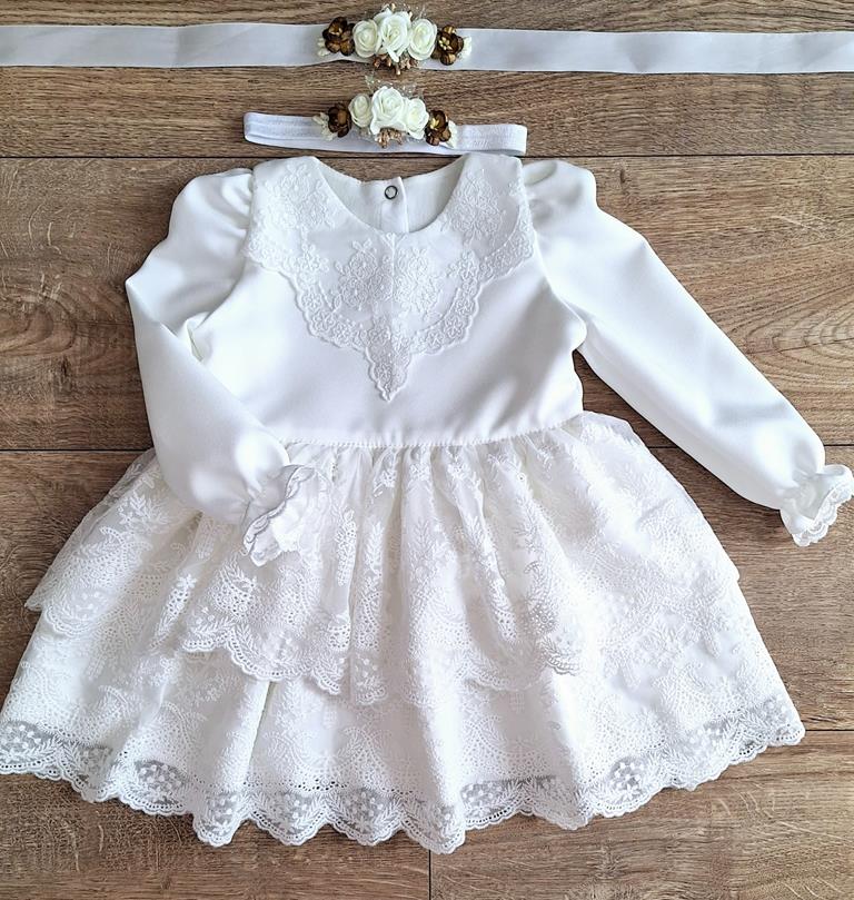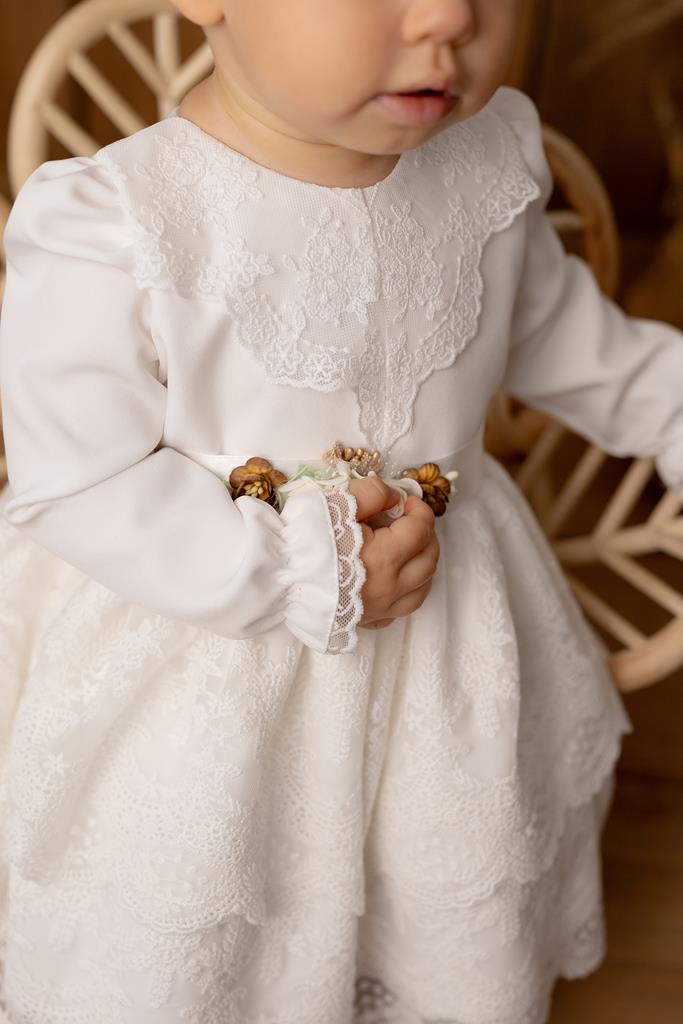 Dół sukienki składa się z dwóch falban wykonanych z bogato zdobionej koronki, dodając sukience lekkości i elegancji. Oryginalny i miękki bawełniany haft, z którego wykonana jest sukienka, zapewnia komfort i delikatność, co sprawia, że sukienka nadaje się nawet dla najmłodszych dziewczynek.