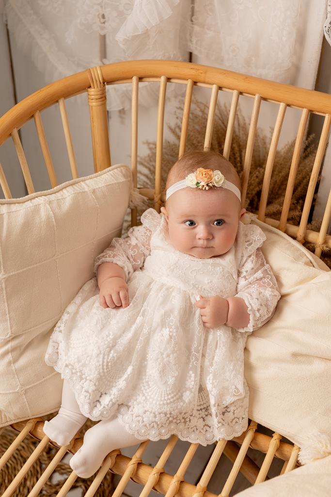 Sukienka do chrztu „GRACE” to wyjątkowa kreacja w delikatnym kolorze śmietankowym. Została wykonana w całości z delikatnej i miękkiej koronki. Misternie haftowany tiul o pięknym wzorze doskonale podkreśla styl sukienki. Ta sukienka na chrzest dla dziewczynki została stworzona z myślą o najnowszych trendach w modzie dziecięcej. Starannie wybrane tkaniny gwarantują, że sukienka sprawdzi się nawet u najmłodszych dziewczynek. Sukienka została uszyta na bawełnianej podszewce, co zapewnia odpowiednią cyrkulację powietrza i komfort delikatnej skórze dziecka. To idealny wybór na ten wyjątkowy dzień.