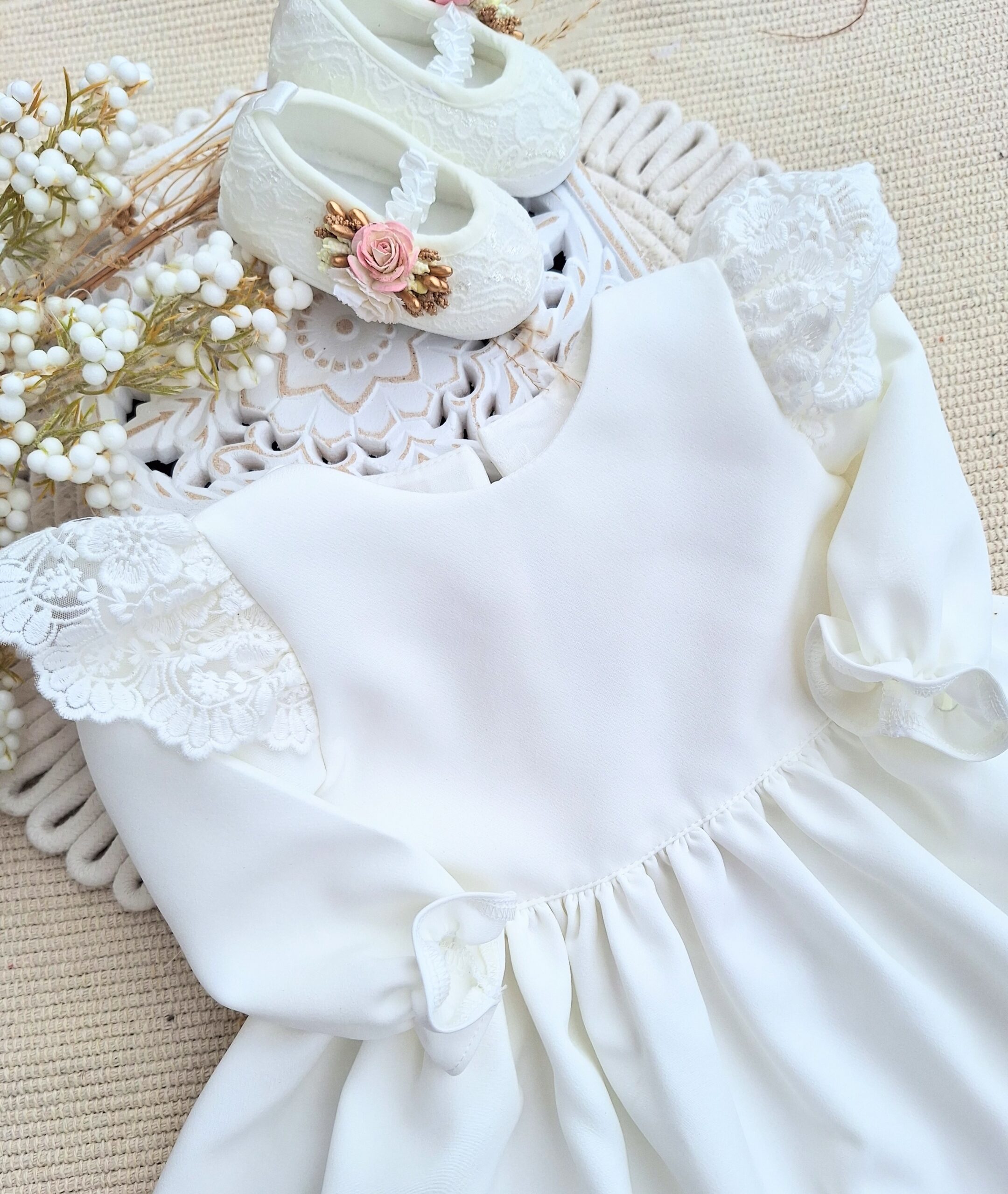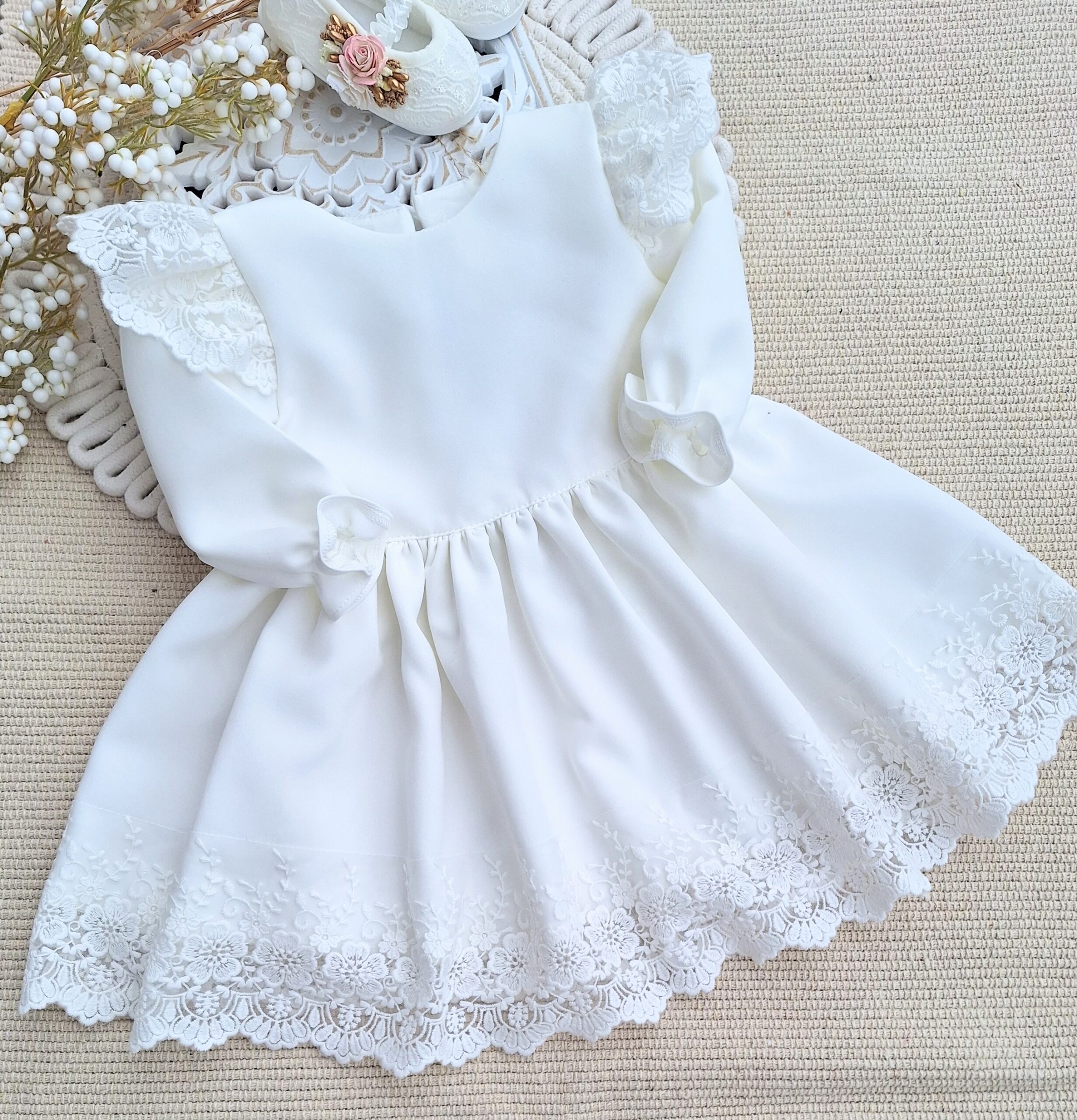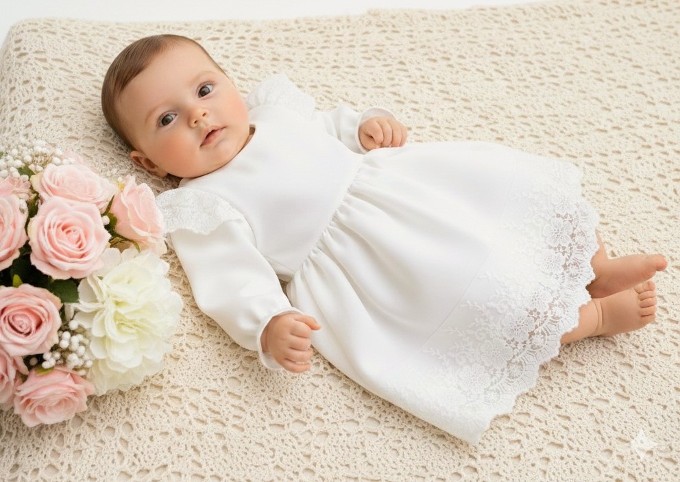 Sukienka do chrztu dla dziewczynki w kolorze ecru.