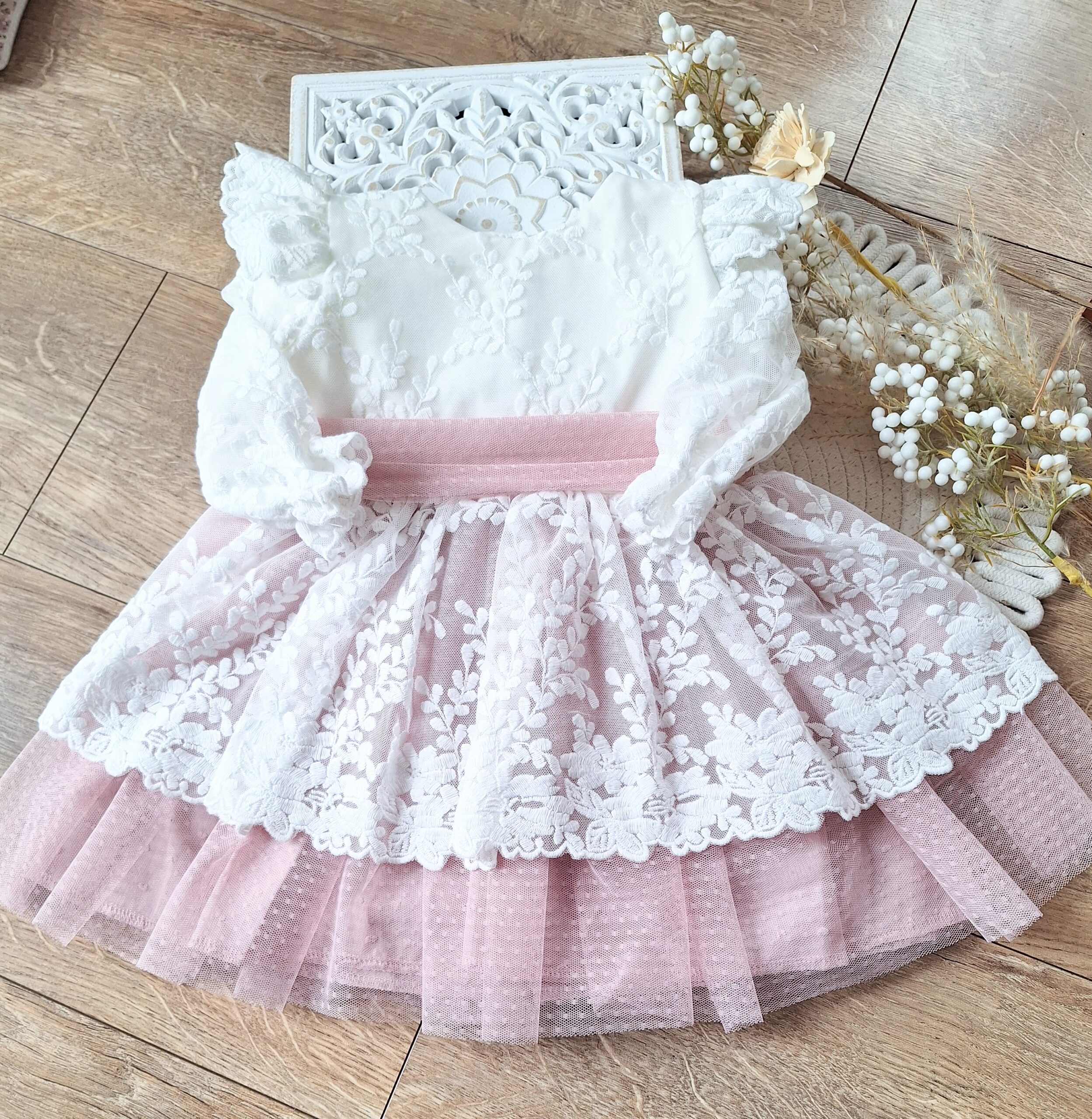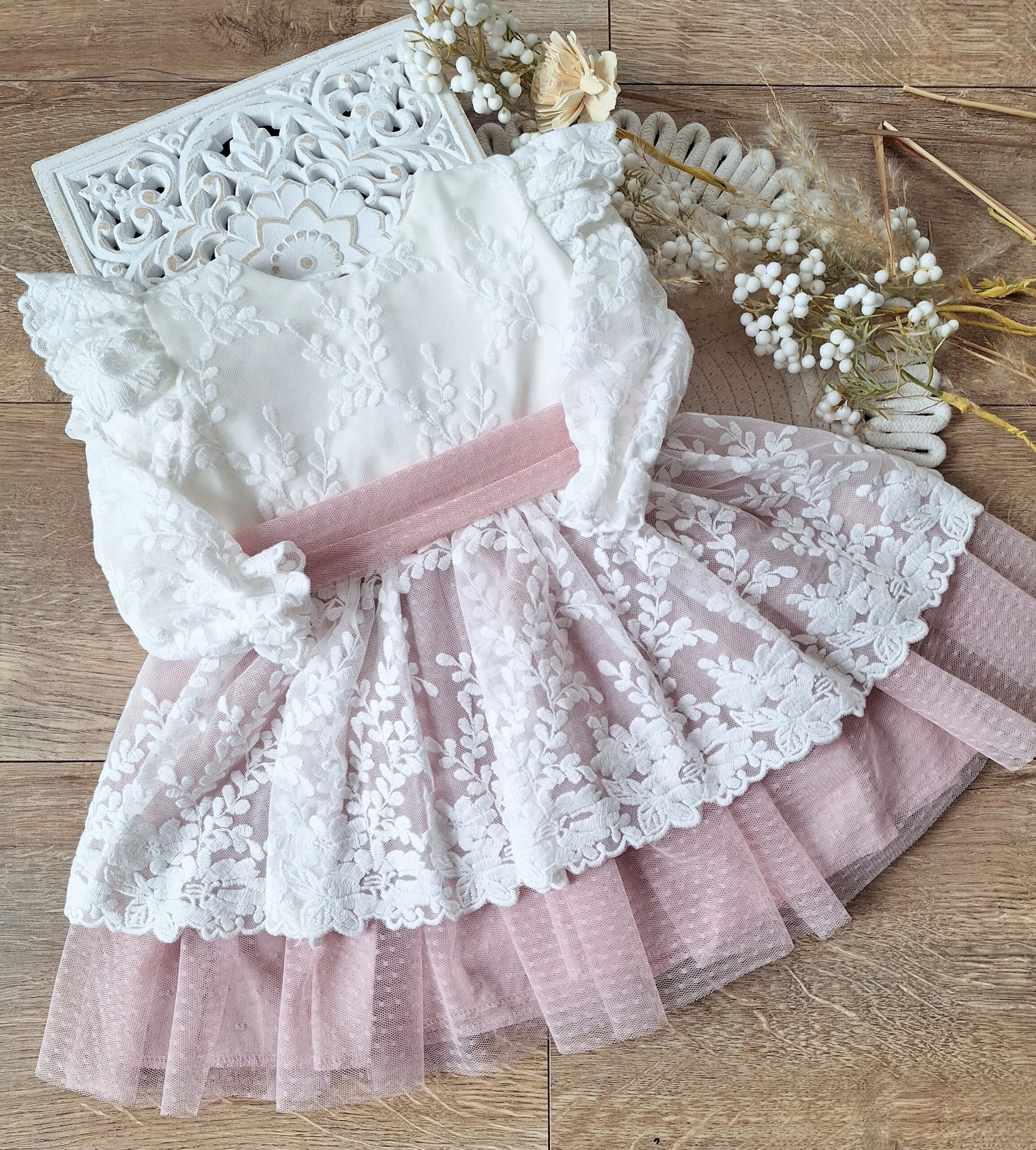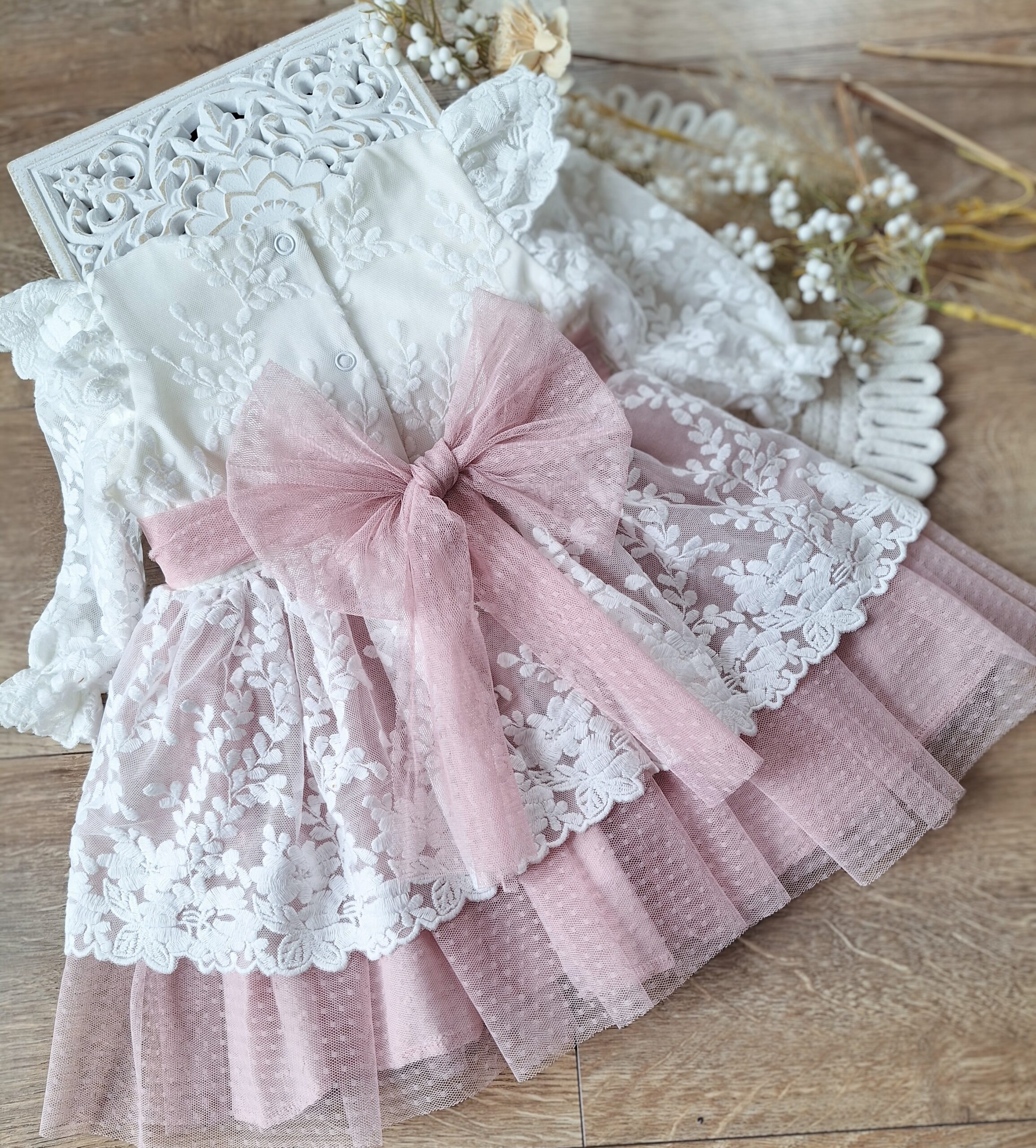 Sukienka do chrztu Lilly Pink to kreacja , która łączy w sobie wygodę i elegancję. Śmietankowa , koronkowa góra sukienki została przełamana różem w dolnej części , który znakomicie podkreśla wzór koronki.