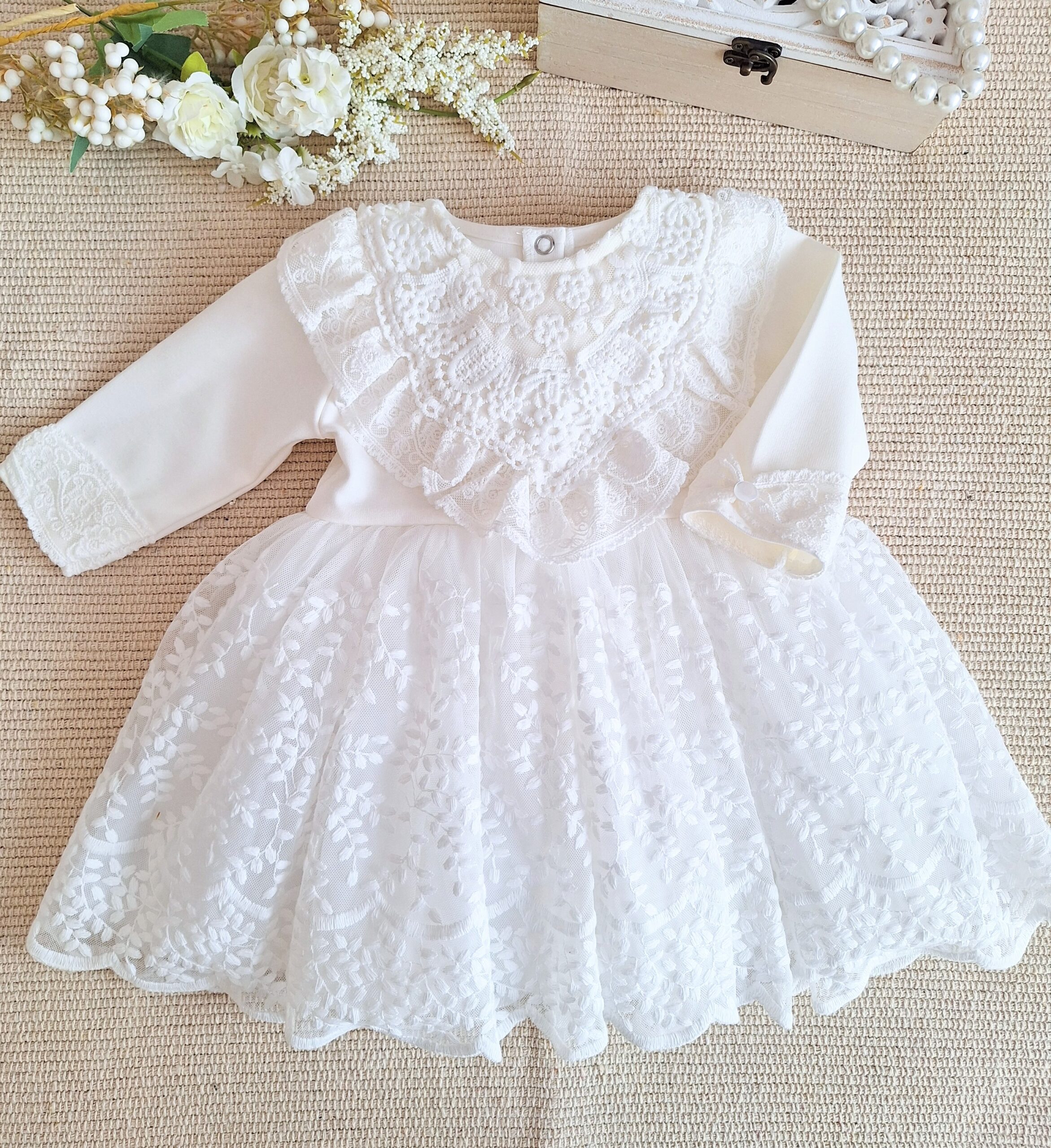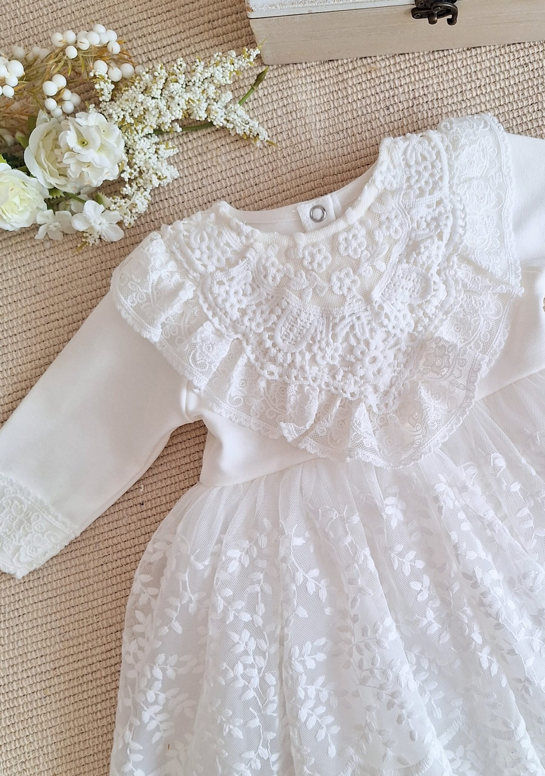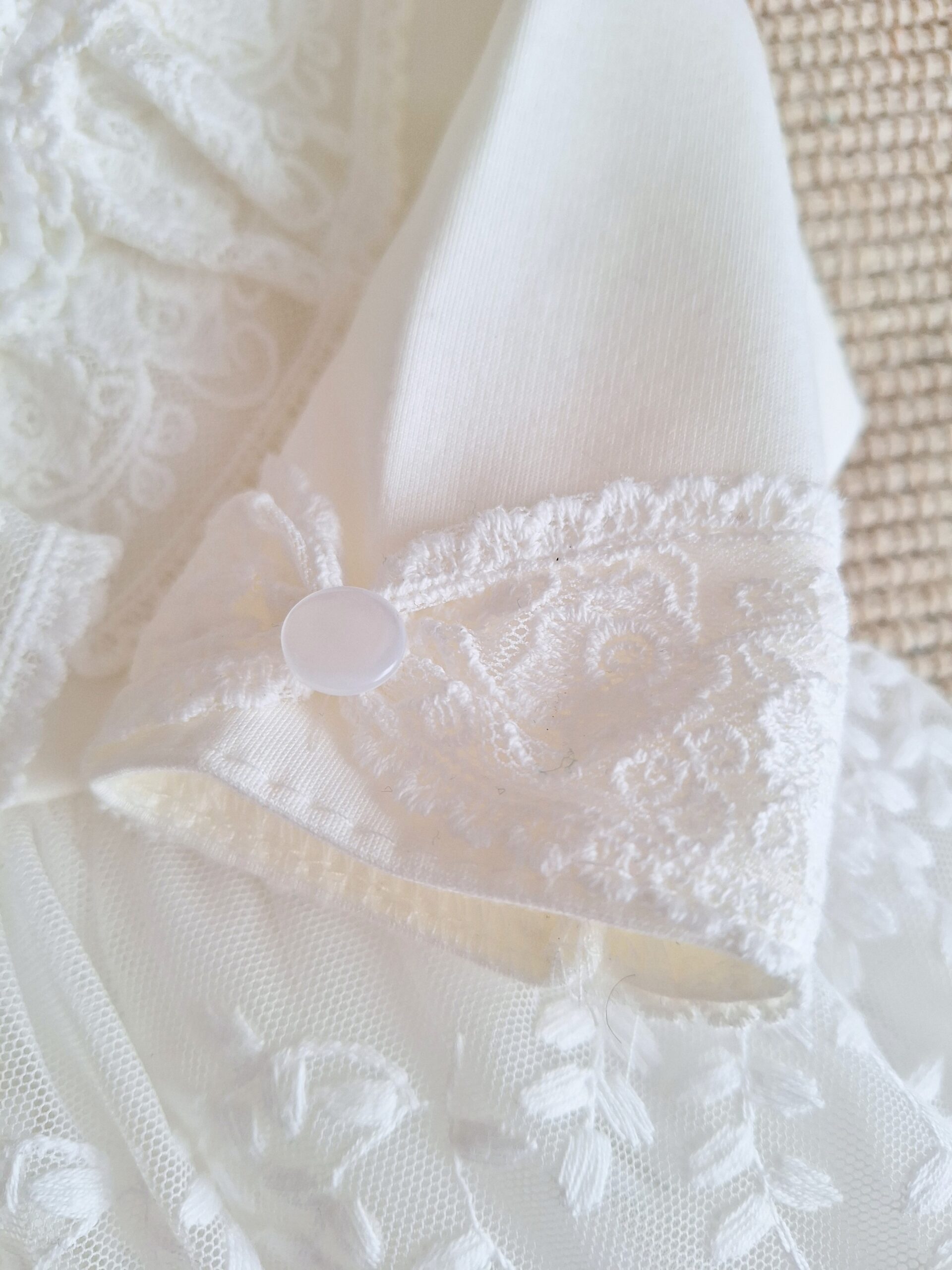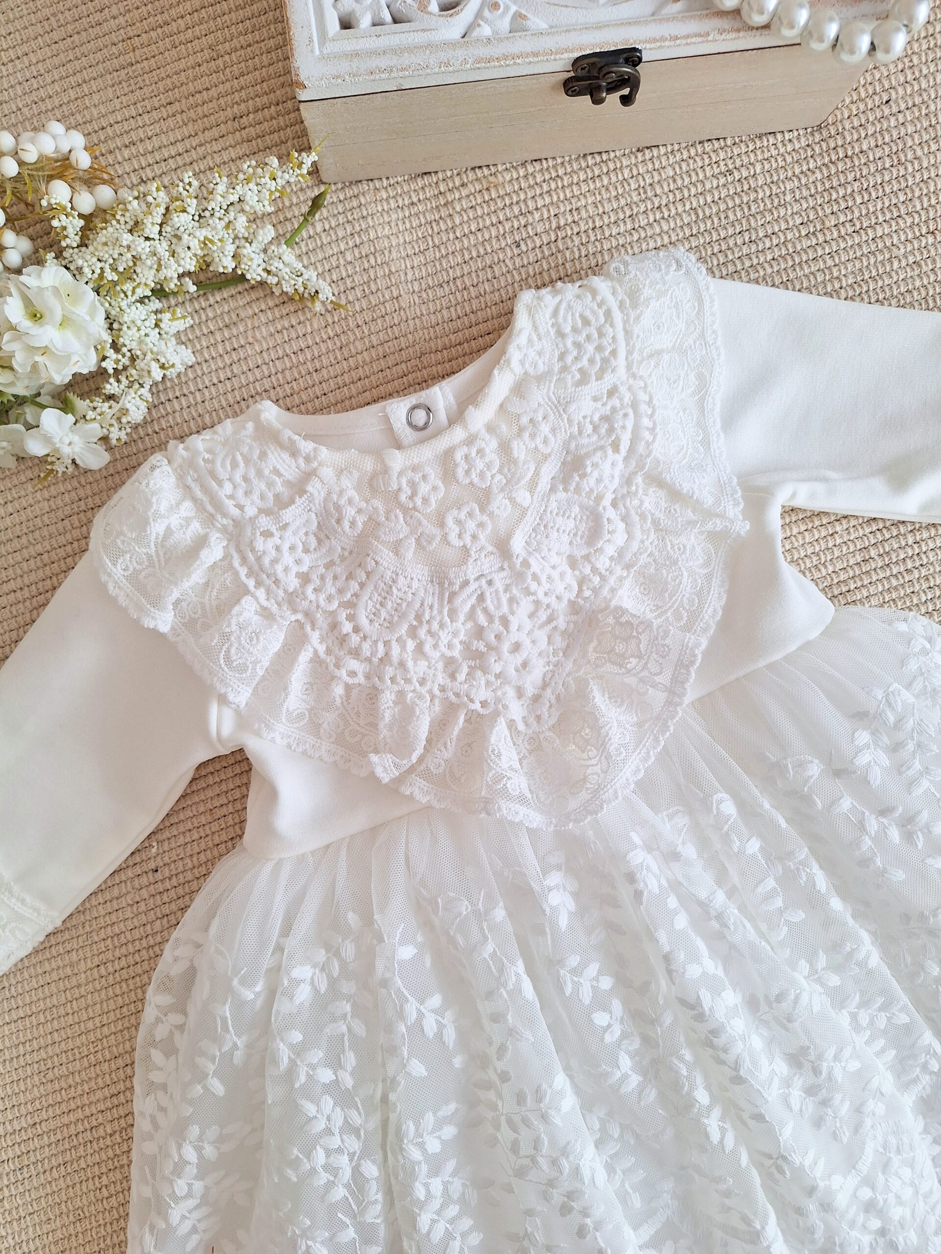 Górę sukienki zdobi ozdobna aplikacja z falbanką. Rękawki zostały wykończone koronką w formie kokardy z ozdobnym perłowym guziczkiem. Na koniec wisienka na torcie- przepiękny dół z miękkiej koronki, podszyty tiulem i bawełnianą podszewką.