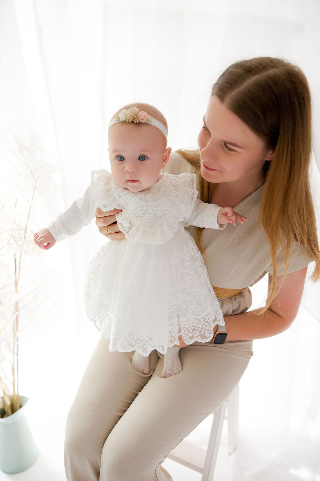 Nowość! Sukienka na chrzest dla dziewczynki Perla-wyjatkowa kreacja w kolorze ecru. Uszyta z przyjemnej wiskozowej dzianiny oraz miękkich koronek .