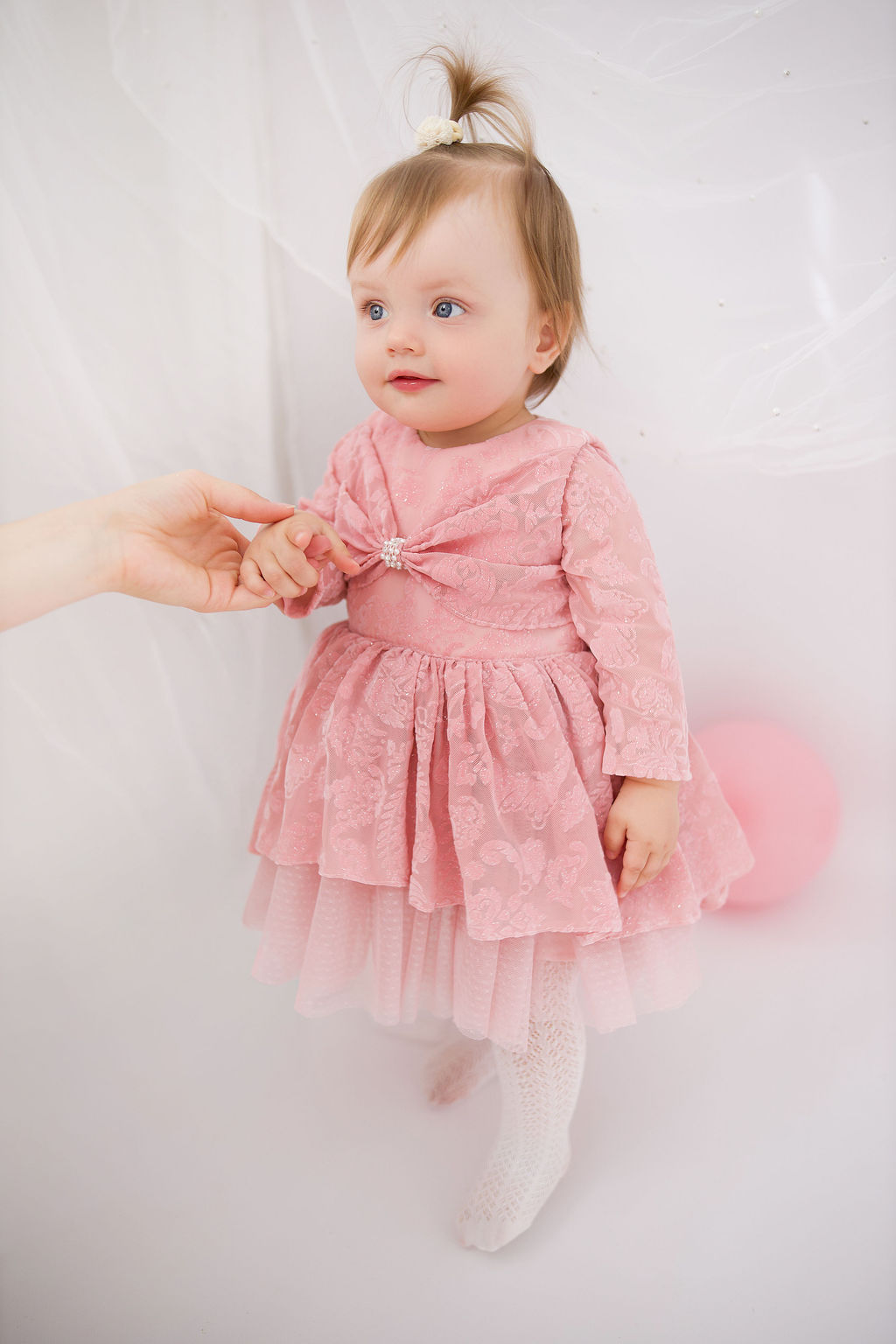 Sukienka PRINCESS to wyjątkowa kreacja dla dziewczynki jeśli planujesz roczek czy urodziny. Góra sukienki uszyta z miękkiej siateczki z ozdobnym flokowym wzorem brokatem . Przód sukienki zdobi duża kokarda z perłowym środkiem .
