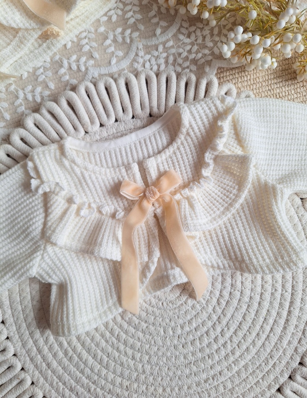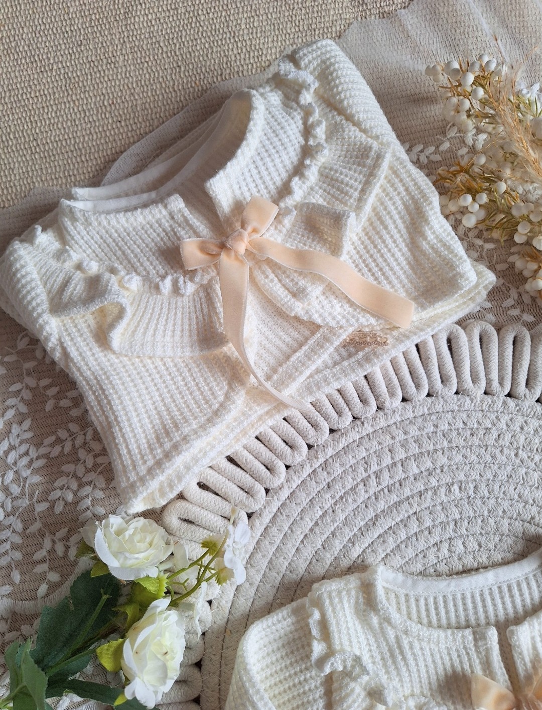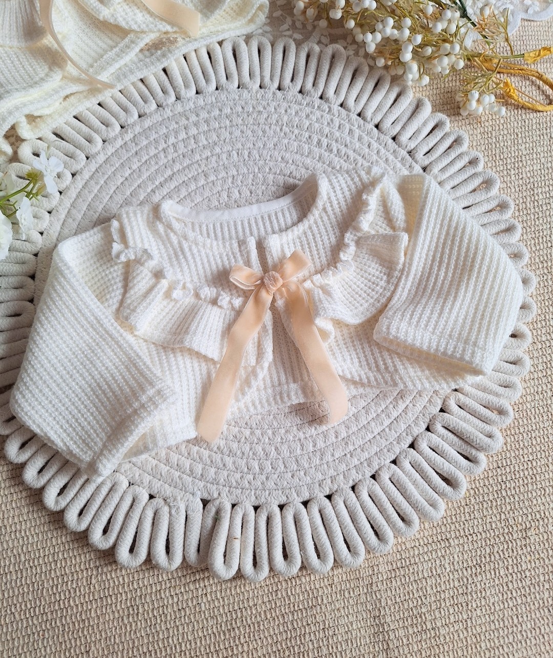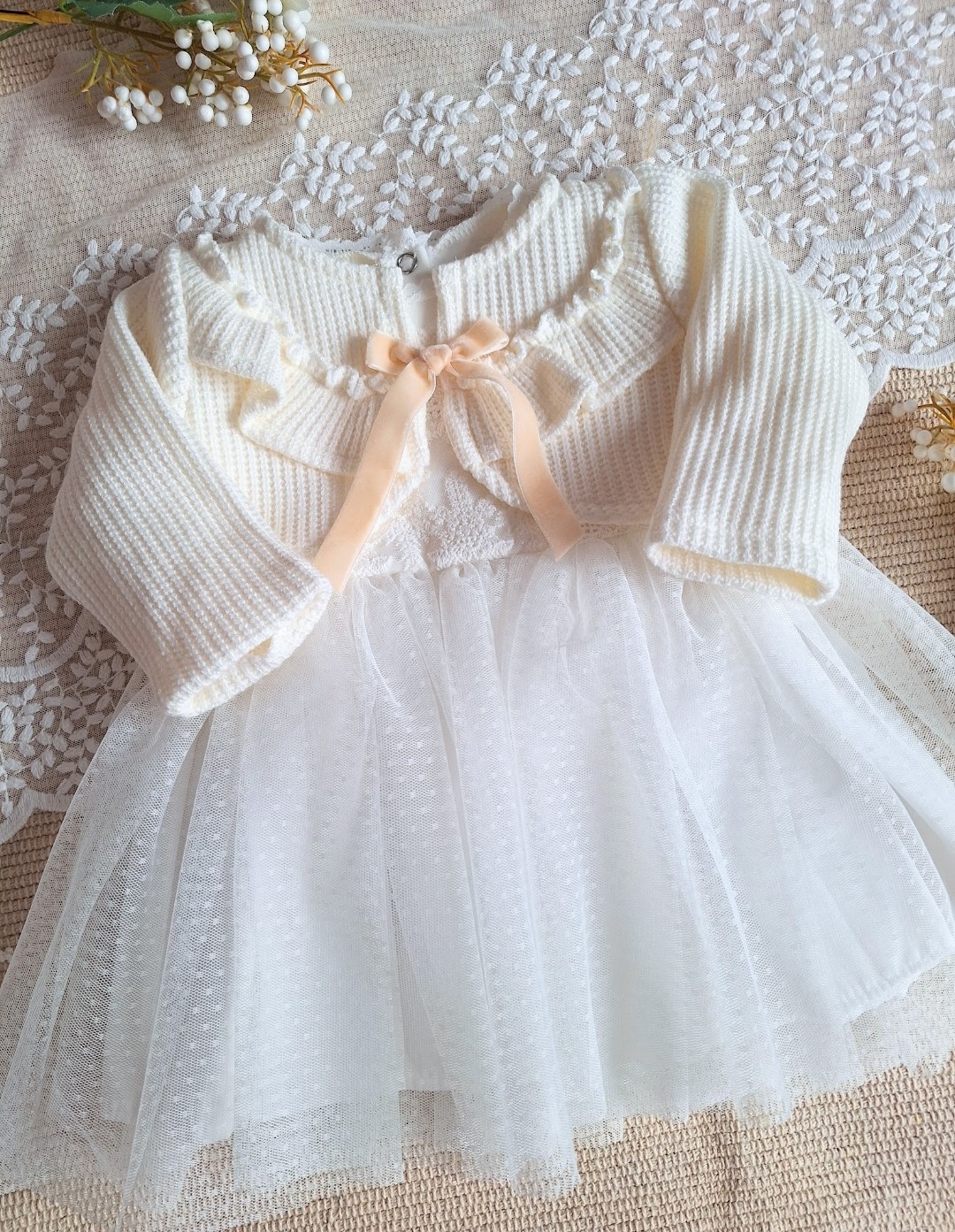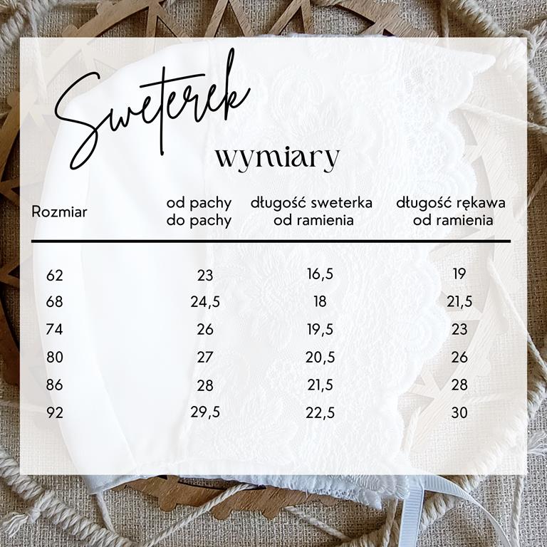 Mięciutki sweterek będzie idealnym dodatkiem do sukienki na chrzest czy inna ważną uroczystość. Dzianina , z której został uszyty jest miękka i plastyczna, w modny wzór prążka.