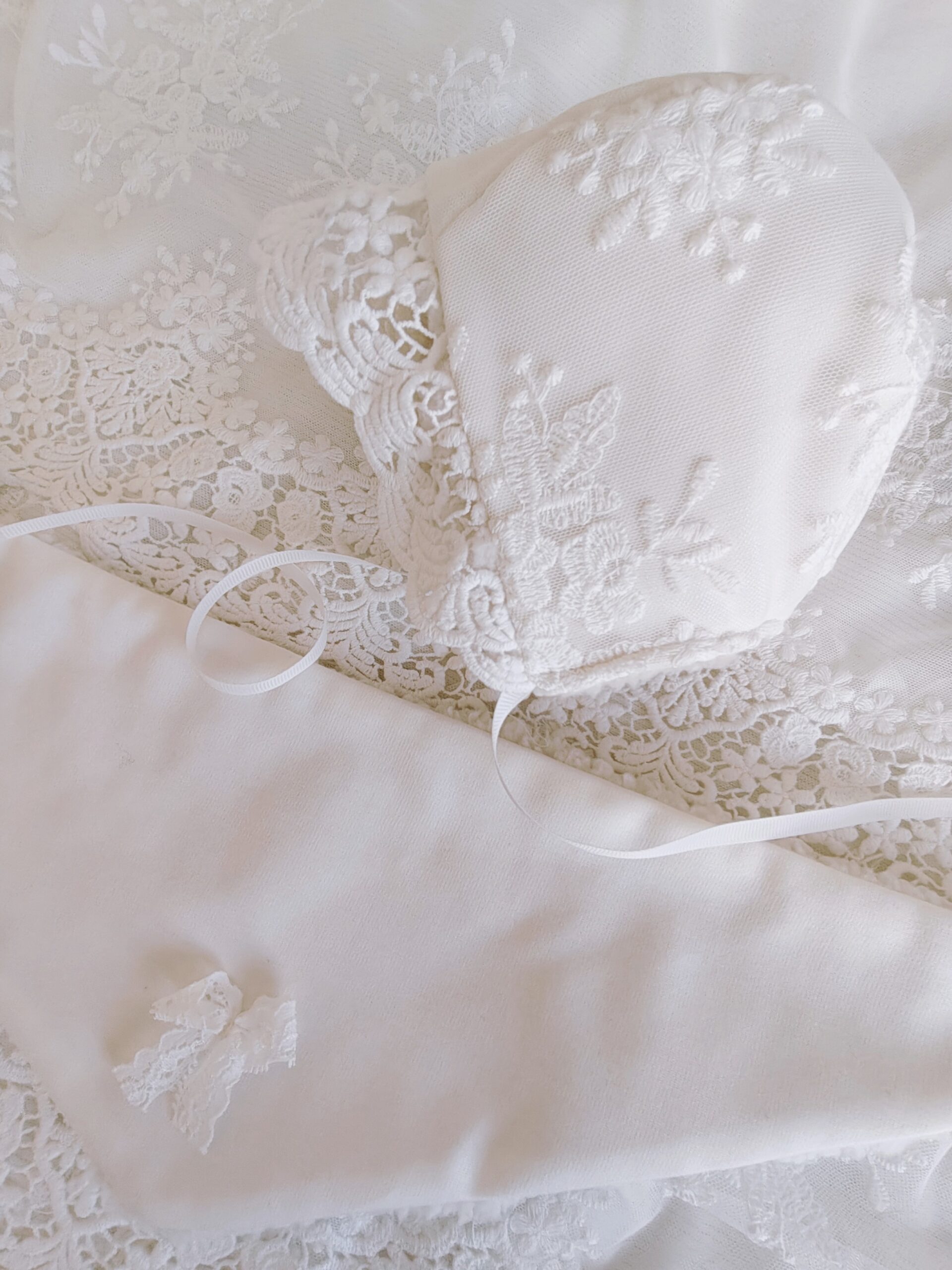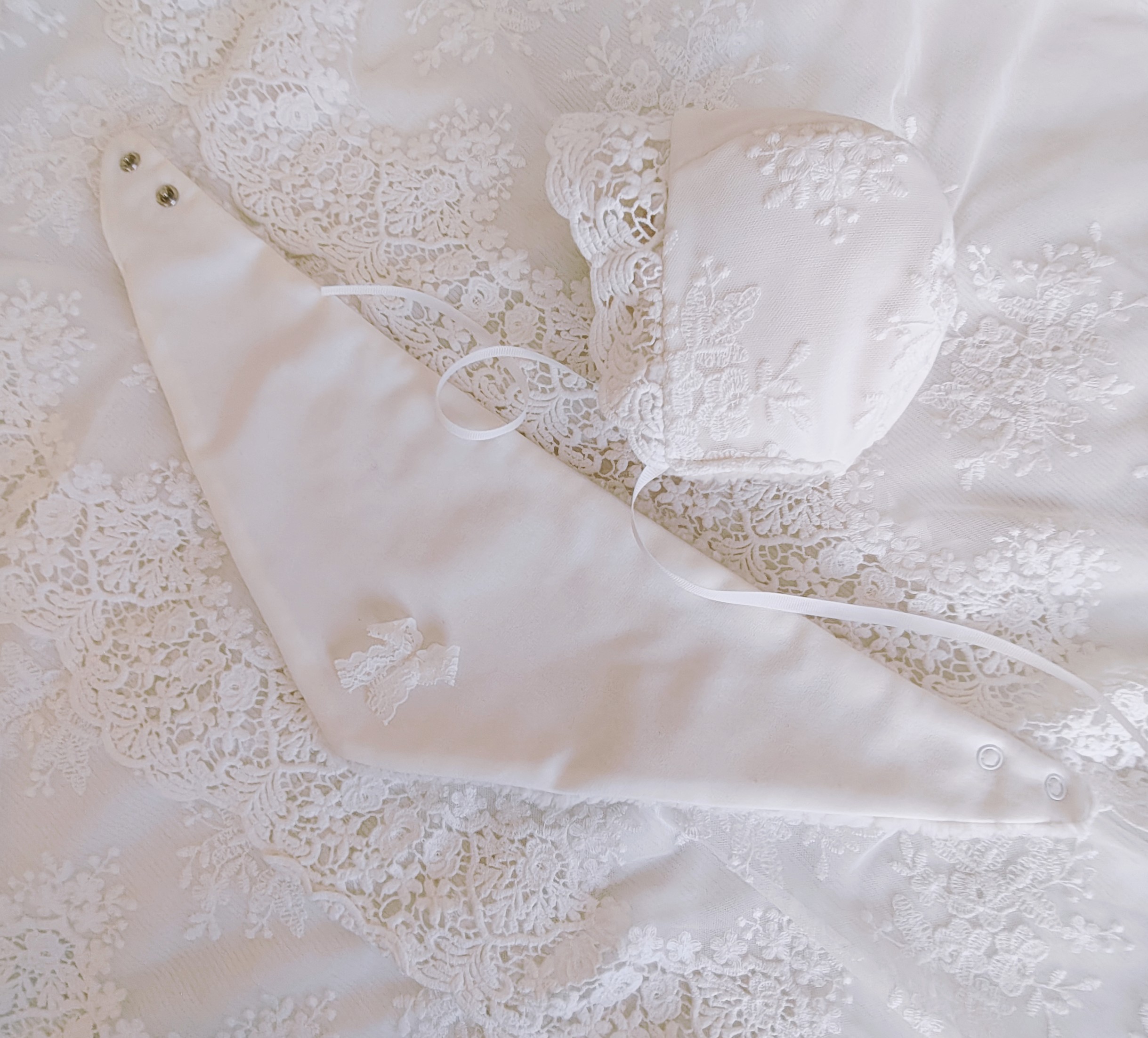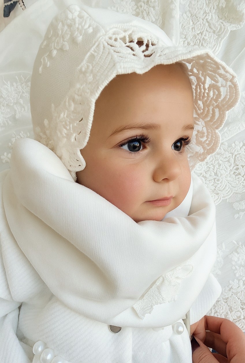 Przepiękny, cieplutki komplet zimowy do chrztu składający się z ocieplanej bonetki oraz chusty zapinanej na napy.