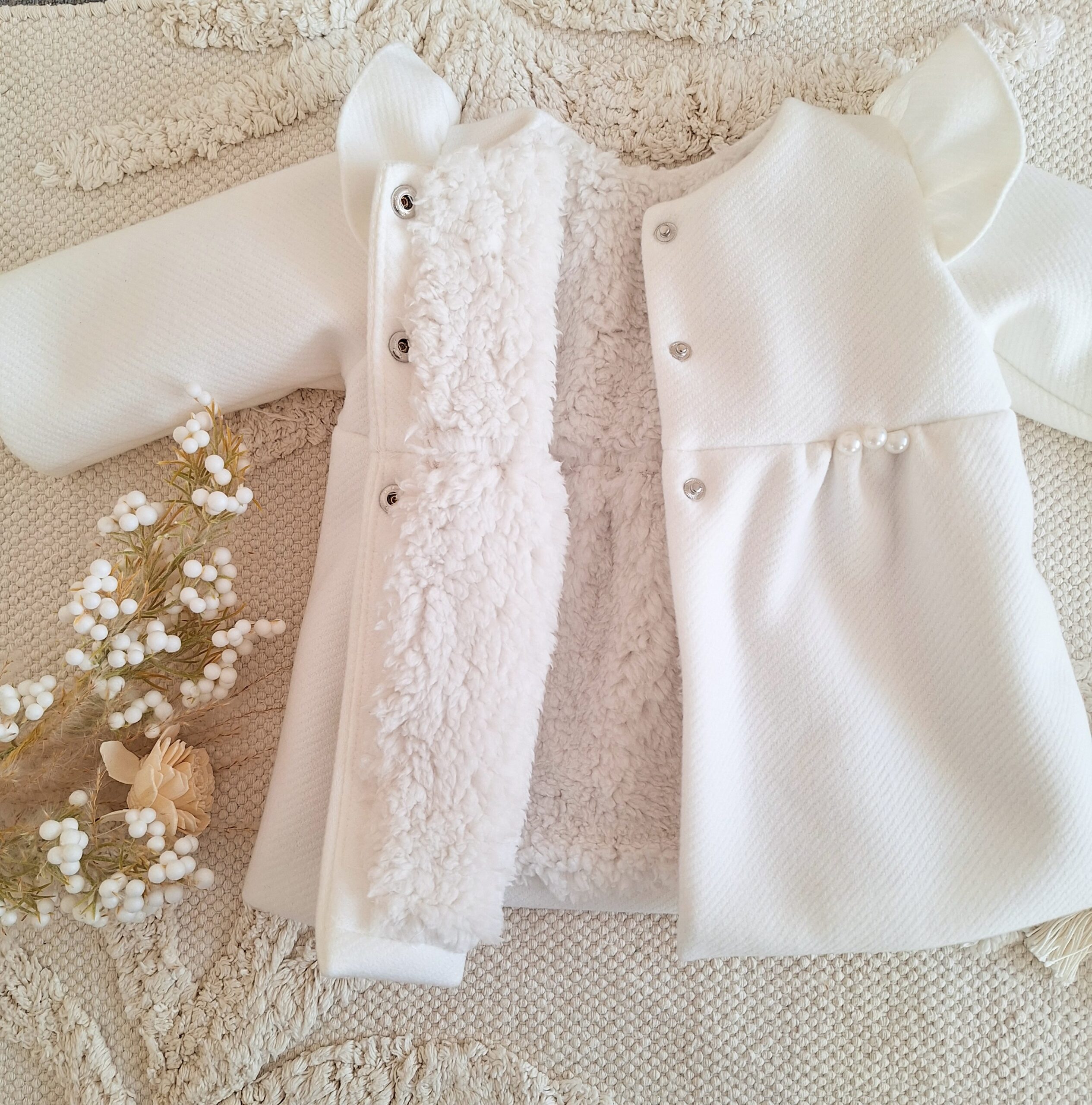 Przedmiotem sprzedaży jest płaszczyk zimowy w kolorze ecru/śmietankowym na miękkiej, futerkowej podszewce. W rękawach znajduje się pikówka z ociepliną aby Ci łatwiej było założyć płaszczyk.